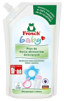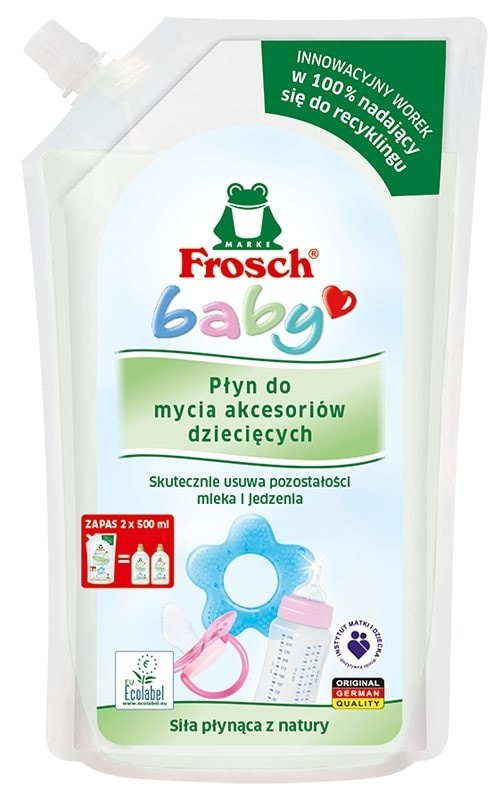 Płyn do mycia akcesoriów dziecięcych Frosch Baby (worek o pojemności 1 litra) chroni i czyści akcesoria dla dzieci, takie jak: smoczki, gryzaki, butelki, talerze, sztućce i inne zmywalne zabawki.