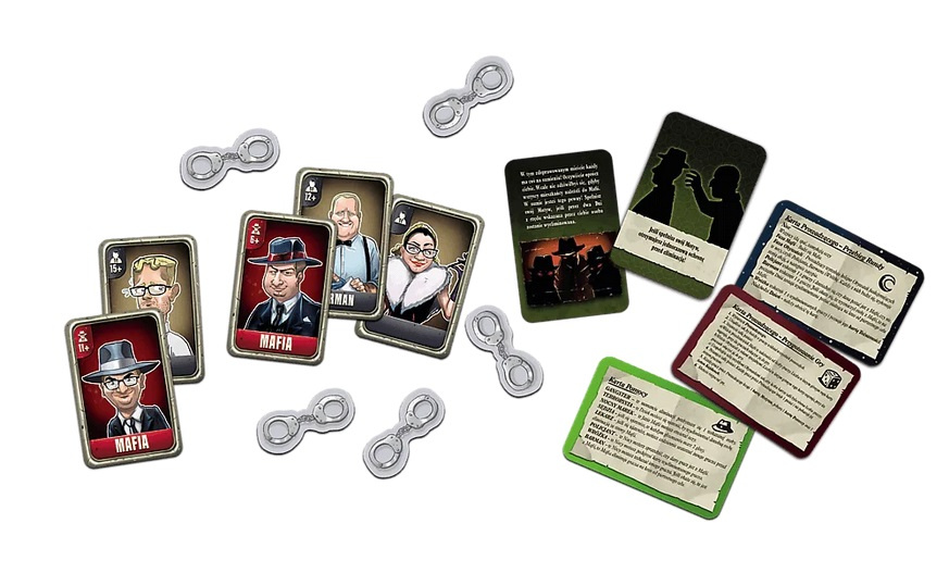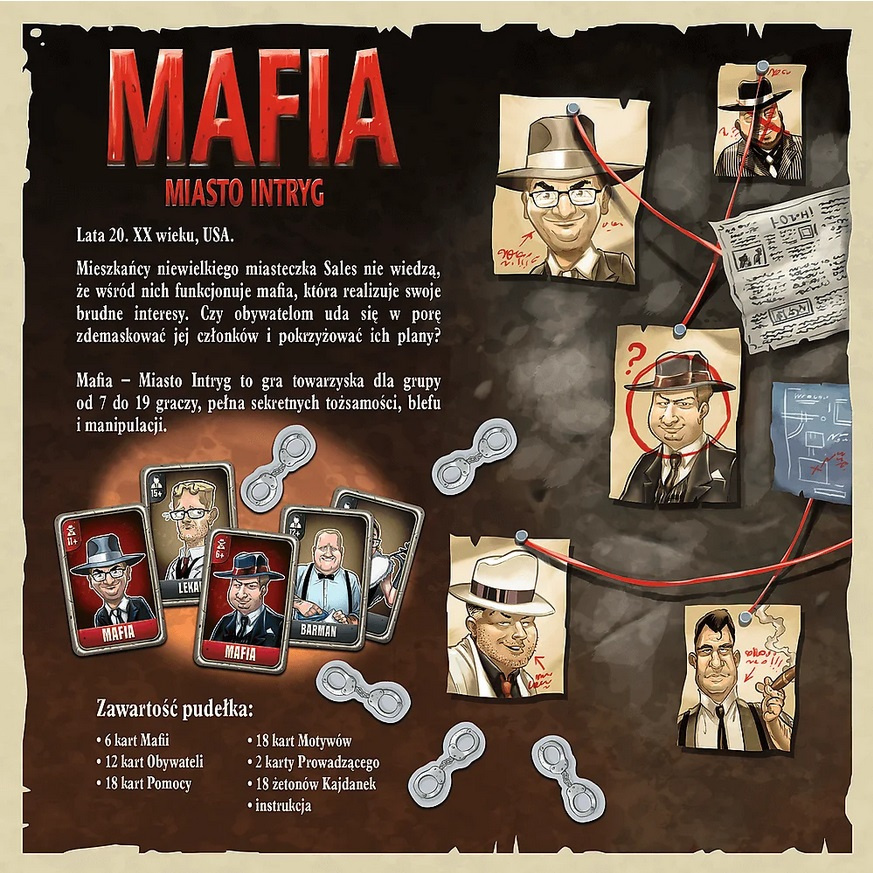 Mafia - Miasto intryg to gra towarzyska dla grupy od 7 do 19 graczy, pełna sekretnych tożsamości, blefu i manipulacji.
