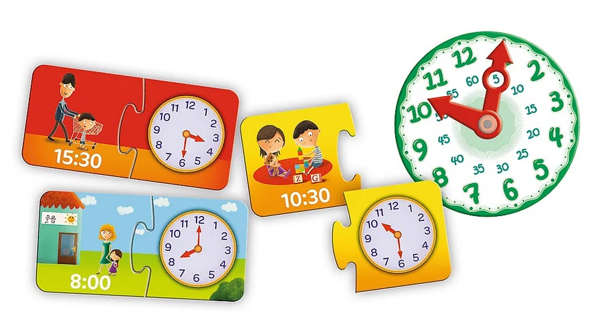 - Zegar na układanka edukacyjna, która w przyjazny sposób określania godzin w formacie analogowym i cyfrowym oraz przyporządkowywania różne sposoby porom dnia.