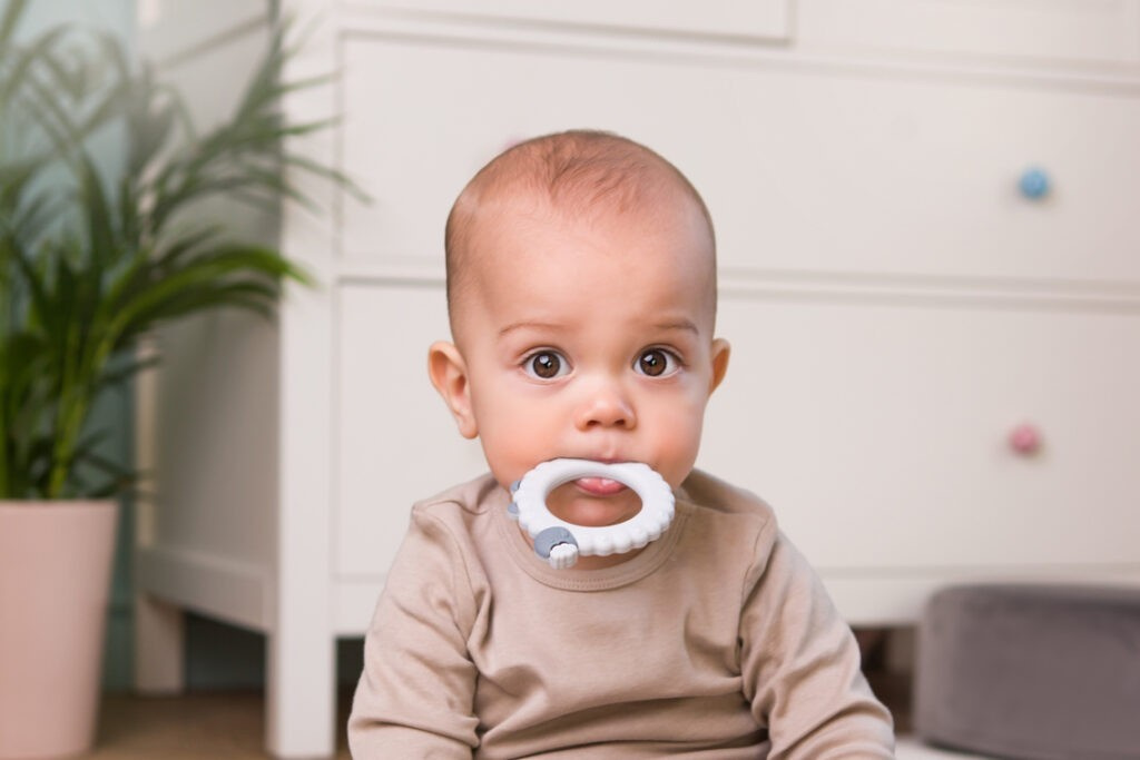 Zróżnicowane faktury masują dziąsła ząbkującego dziecka, przynosząc mu ulgę, a wygodny otwór ułatwia małym rączkom chwytanie zabawki.