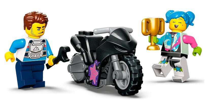 Zawartość opakowania - w środku jest wszystko, czego dzieci potrzebują do zbudowania modelu Wyzwanie kaskaderskie: przewracanie, oraz motocykl kaskaderski i minifigurki z serialu LEGO City Adventures: Galaktyczna Poppy Starr i Harl Hubbs.