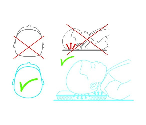 Dzięki piance termoplastycznej z „pamięcią kształtu”, poduszka idealnie dopasowuje się do kształtu główki dziecka, możliwia równomierny nacisk tylnej części głowy dziecka przez co zapobiega jej odkształceniom.