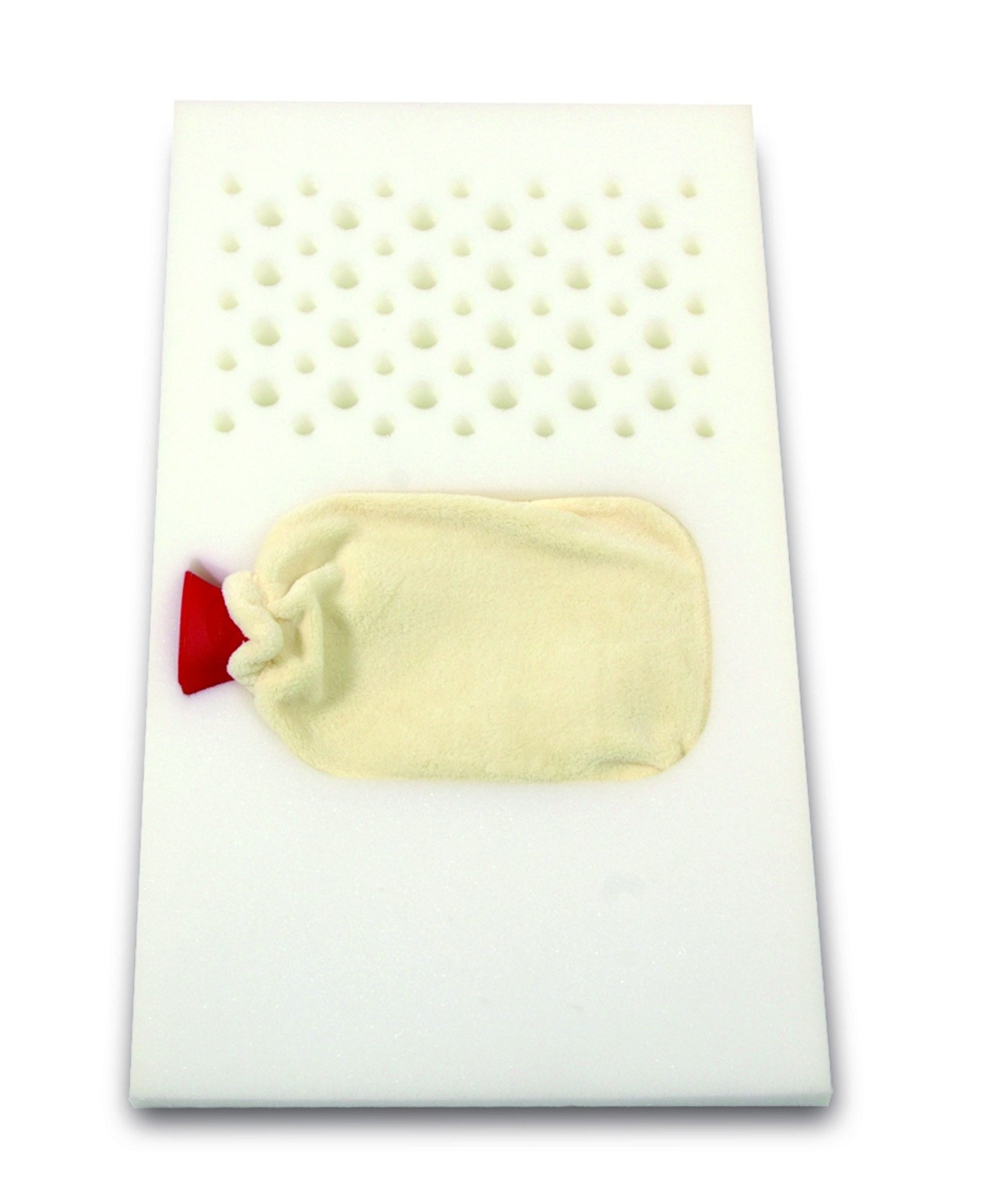 Materacyk ma kształt klina z wyciętym miejscem na termofor.