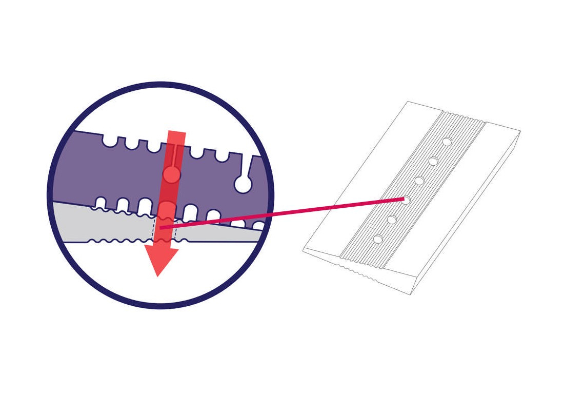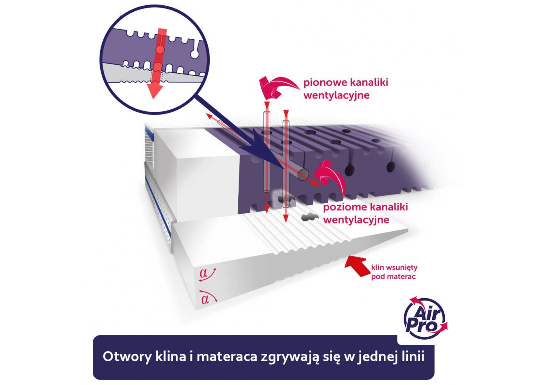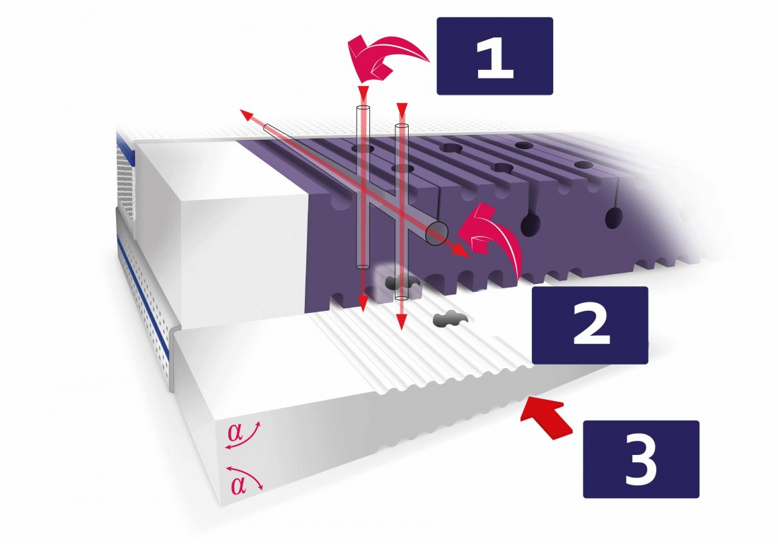 Pionowe kanaliki wentylacyjne klina i materaca Rücken zaprojektowane są tak, by były zawsze w tej samej linii. Taka budowa sprawia, że wentylacja jest niezakłócona, co pozwala usuwać na bieżąco CO2 oraz nadmiar ciepła i wilgoci poza środowisko snu maluszka. Dodatkowo perforowana pianka na obu płaszczyznach klina wzmacnia przepływ powietrza między klinem a materacem.