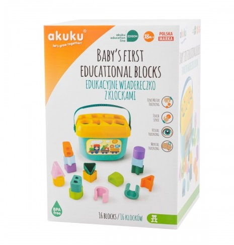- Edukacyjne wiaderko wprowadza dziecko w świat kształtów, kolorów i literek.