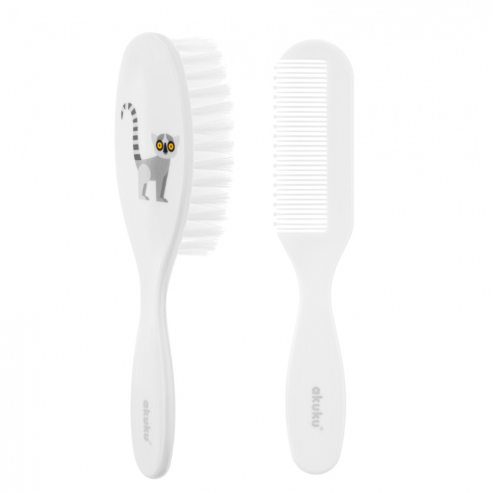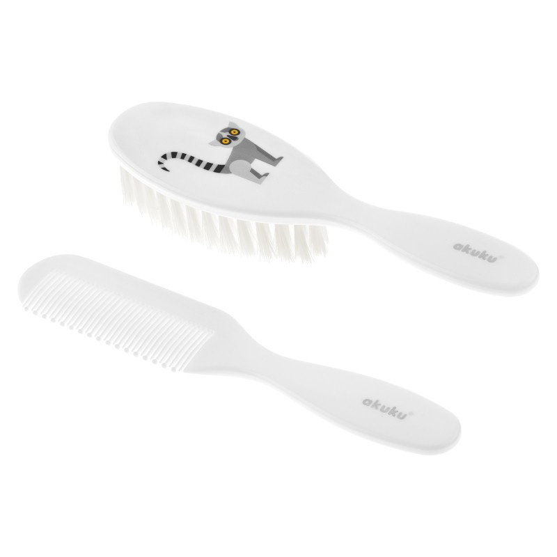 - Bezpieczna i delikatna szczotka do czesania dziecięcych włosów wykonana z włosia sztucznego w zestawie z grzebieniem.