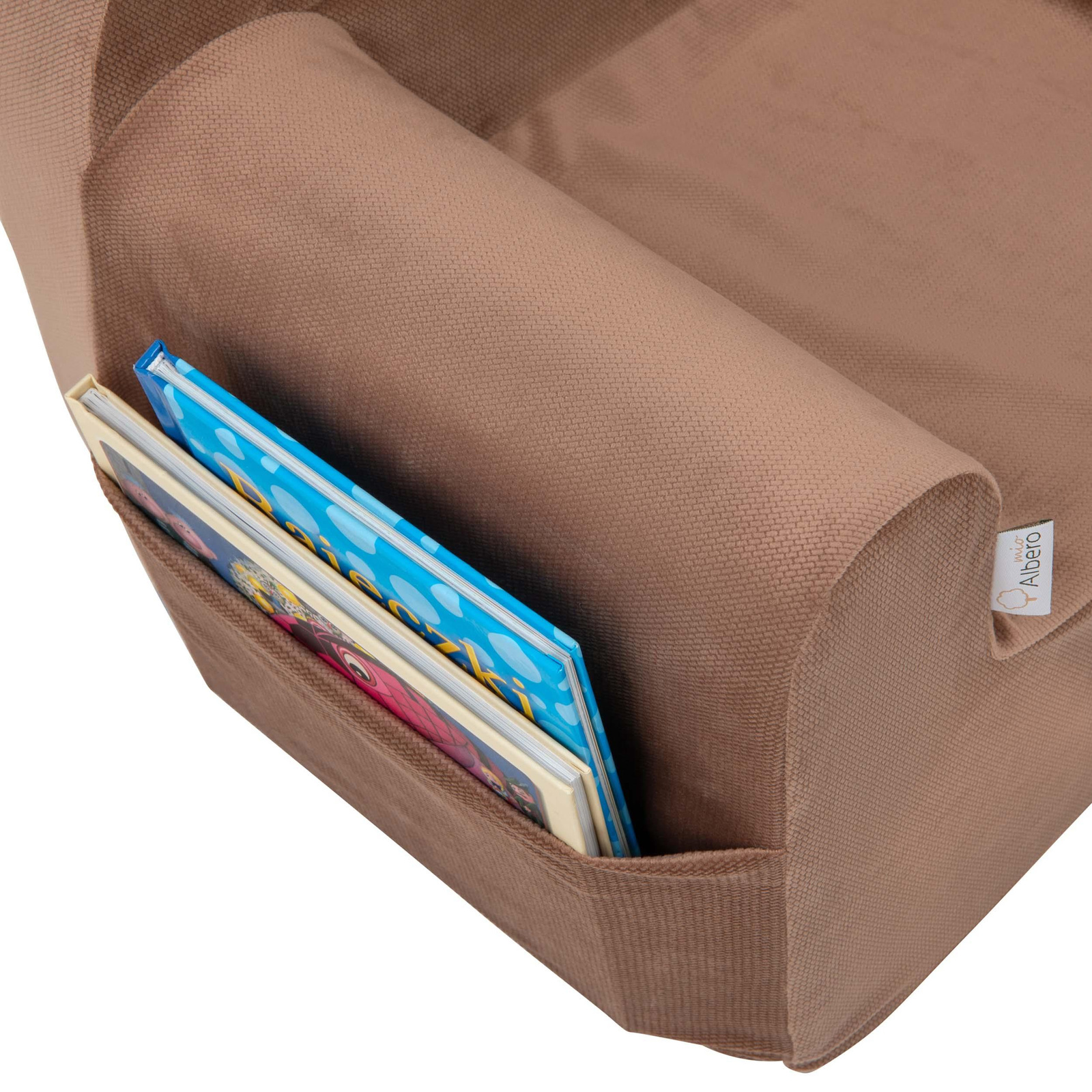 W oparcie fotelika wyszyty jest uchwyt który ułatwia jego przenoszenie , a na jednym z boków jest kieszonka na drobne skarby.
