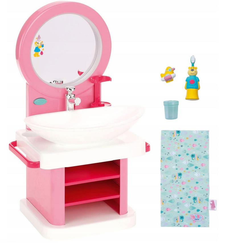 Umywalka posiada kran z pompką, dzięki czemu zabawie może towarzyszyć woda, w zestawie jest także korek do umywalki z zabawną kaczuszką. Przy umywalce umieszczone jest duże lusterko Pod blatem znajdują się półeczki na wszystkie akcesoria a po bokach uchwyty na ręczniki.