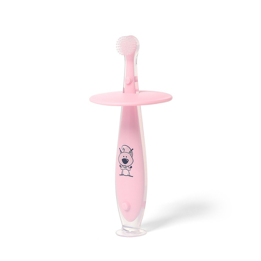 - Delikatna silikonowa szczoteczka do zębów z ogranicznikiem chroniącym przed zbyt głębokim włożeniem do buzi.