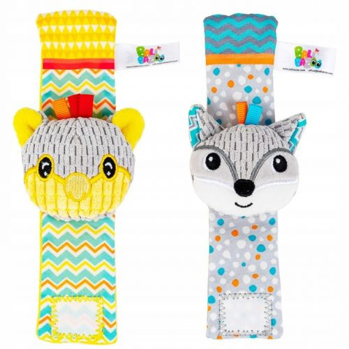 Obie grzechotki zapinane są na rzep. Jedną bransoletkę zdobi koala, a drugą szop, a z tego uroczego duetu można korzystać równocześnie lub oddzielnie, wybierając tę grzechotkę, którą w danym momencie maluszek interesuje się bardziej.