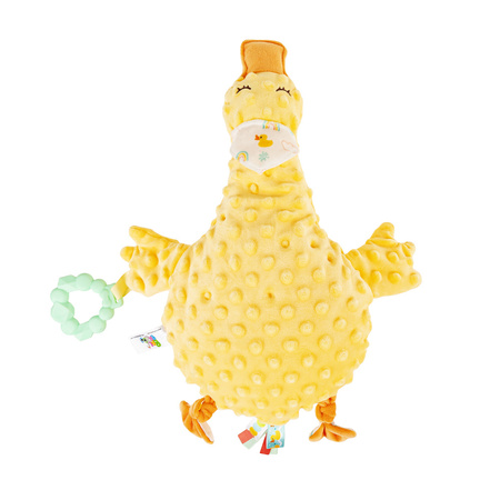 Żółciutka kaczuszka jest milusia i urocza, a jej skrzydełko zdobi gryzaczek, który przyniesie ulgę obolałym dziąsłom ząbkującego dziecka.
