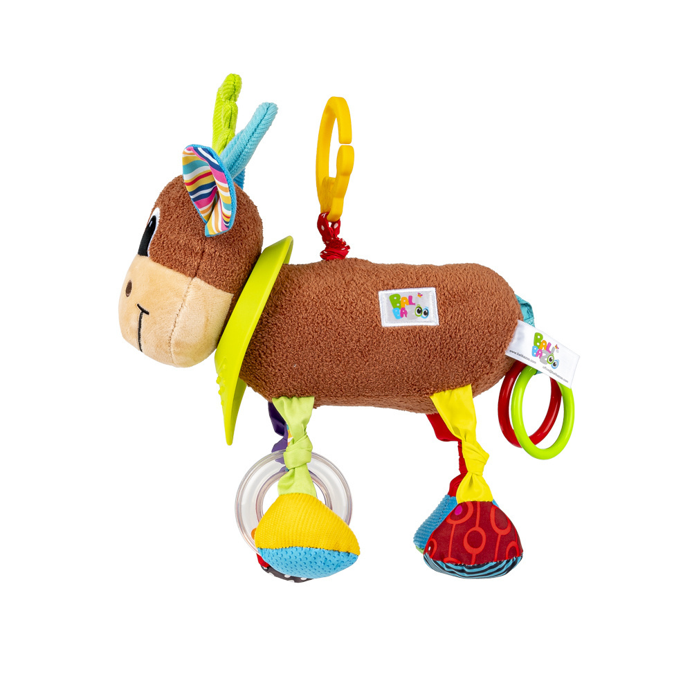 Między kopytkami zwierzaka, kołysze się obręcz z grzechoczącymi koralikami, a w miejscu łosiowego ogonka, dwa kolorowe kółeczka.