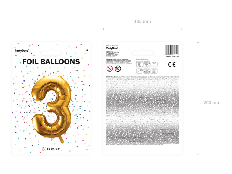 - Balon foliowy metalizowany Cyfra 3 w kolorze złotym, rozmiar przed napompowaniem ok. 100 cm (39''), rozmiar po napompowaniu ok. 86 cm (34''). Do napompowania powietrzem i helem. Balon jest samouszczelniający się. Posiada haczyki ułatwiające montaż balona