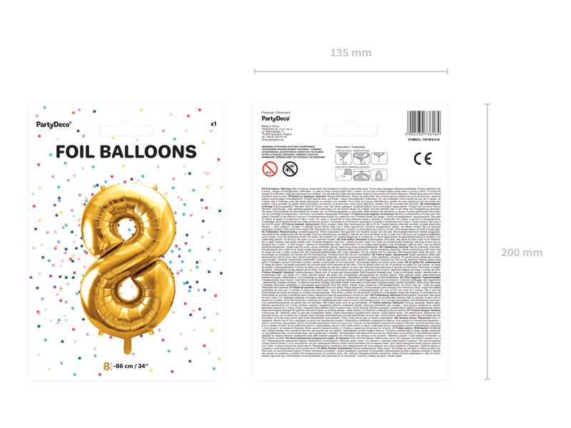 - Balon foliowy metalizowany Cyfra 8 w kolorze złotym, rozmiar przed napompowaniem ok. 100 cm (39''), rozmiar po napompowaniu ok. 86 cm (34''). Do napompowania powietrzem i helem. Balon jest samouszczelniający się. Posiada haczyki ułatwiające montaż balona