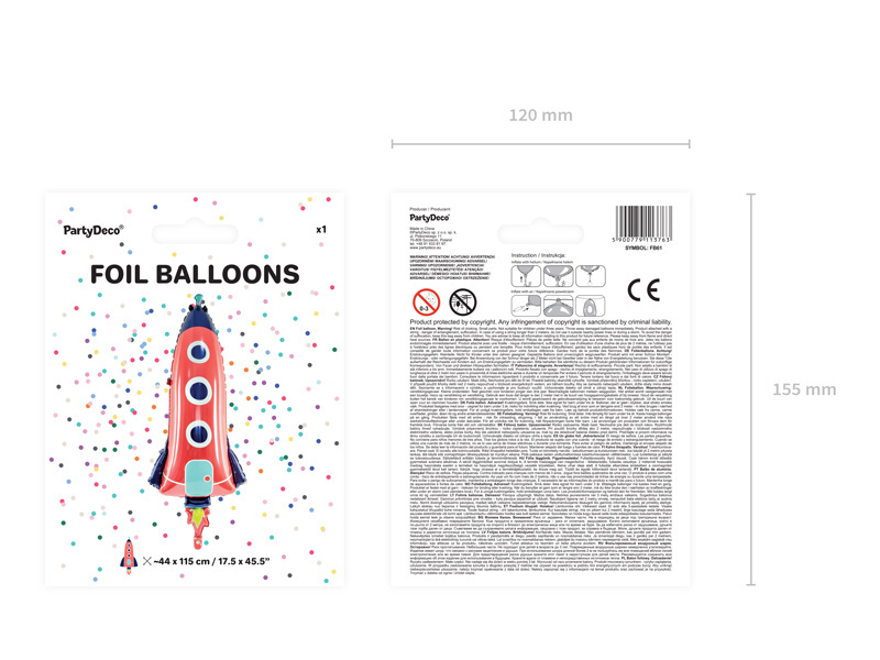 Błyszczący balon foliowy Rakieta, mix kolorów, wymiary ok. 44 x 115 cm (17.5 x 45.5'').