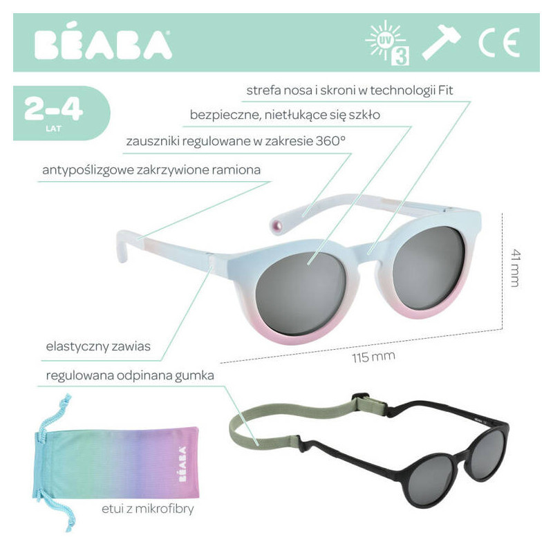 Okulary przeciwsłoneczne z kolekcji Happy francuskiej marki BEABA przeznaczone są dla dzieci powyżej 2. roku życia. Zaprojektowane z naciskiem na praktyczność, bezpieczeństwo i wygodę użytkowania, a przede wszystkim ochronę oczu malucha.