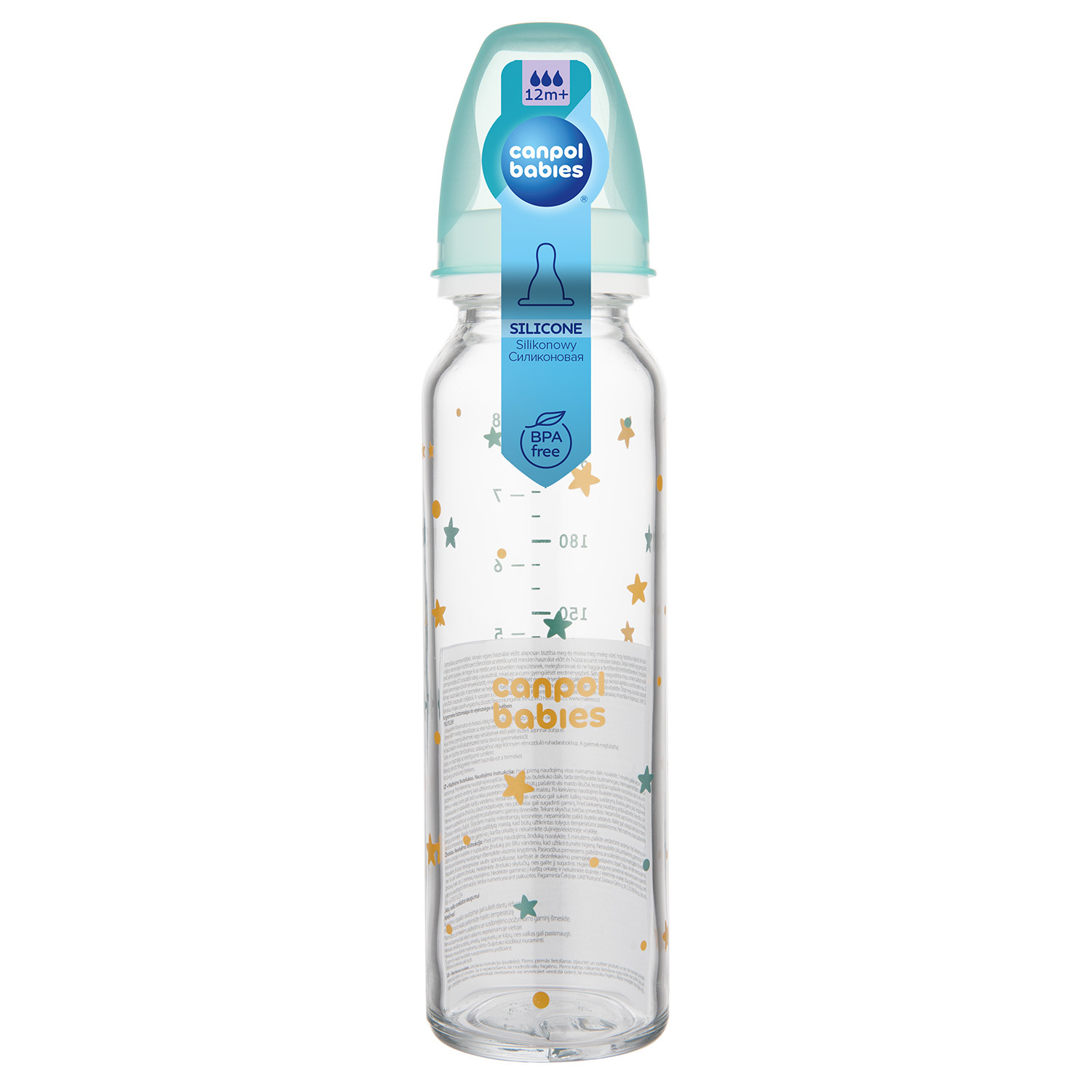 Butelka szklana wąska Canpol babies 240 ml została wyposażona w okrągły smoczek silikonowy o przepływie odpowiednim dla dzieci, które skończyły 12 miesiąc życia. Jest bezpieczna, łatwa do utrzymania w czystości, przezroczysta i lekka.
