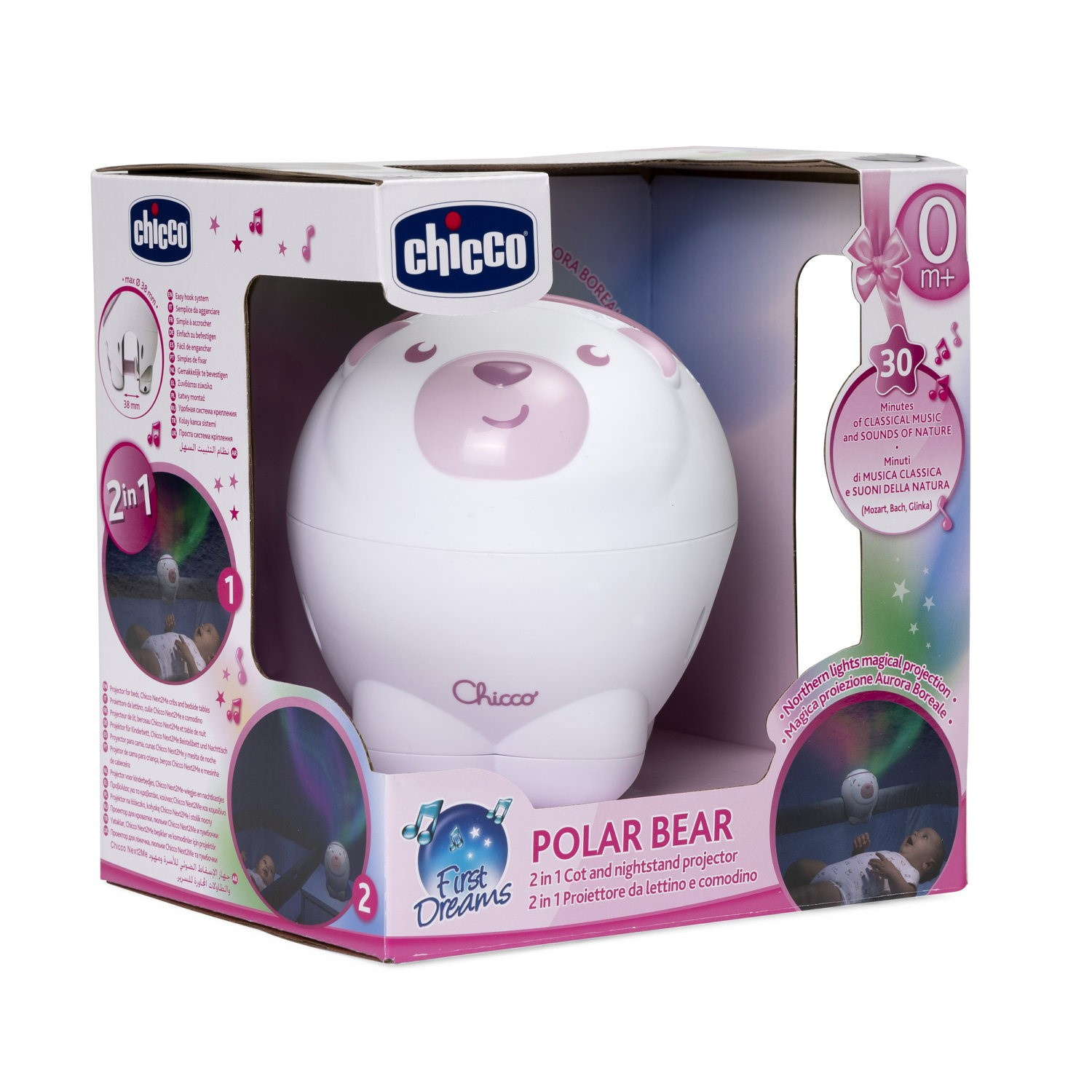 Uroczy niedźwiadek polarny, który tworzy cudowną atmosferę do wypoczynku dziecka dzięki projekcjom odtwarzającym zorzę polarną.