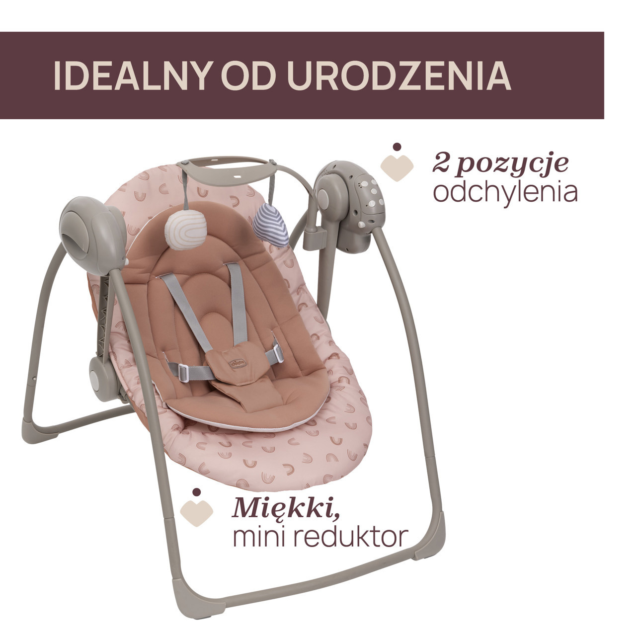 Huśtawka Swing & Play zapewnia bezpieczne i wygodne miejsce odpoczynku dla najmłodszych już od pierwszych dni życia.