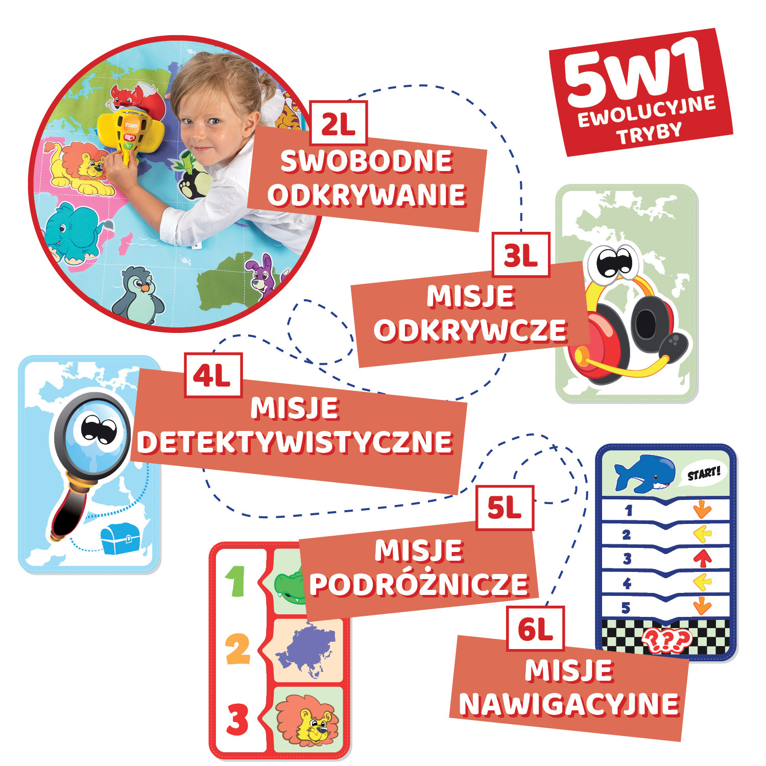 Innowacyjna technologia rozpoznawania kolorów: zabawka jest wyposażona w zupełnie nową technologię czujnika kolorów, która pozwala samolotowi rozpoznawać 31 różnych kart misji oraz 20 zwierząt i kontynentów za pomocą oprogramowania i sprzętu do rozpoznawania kolorów.