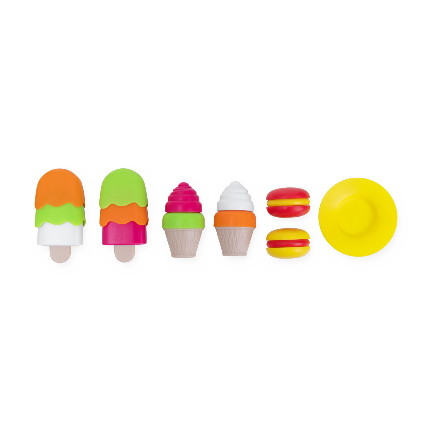 Bogaty zestaw 19 elementów – w tym rożki, różne smaki lodów, polewy, ciasteczka makaroniki i talerzyk - zapewnia nieograniczone możliwości zabawy.