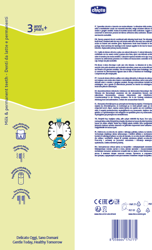 - Chicco Szczoteczka elektryczna odpowiednia dla dzieci w wieku 3 lat i starszych, dostosowana do ich potrzeb i delikatnych dziąseł.