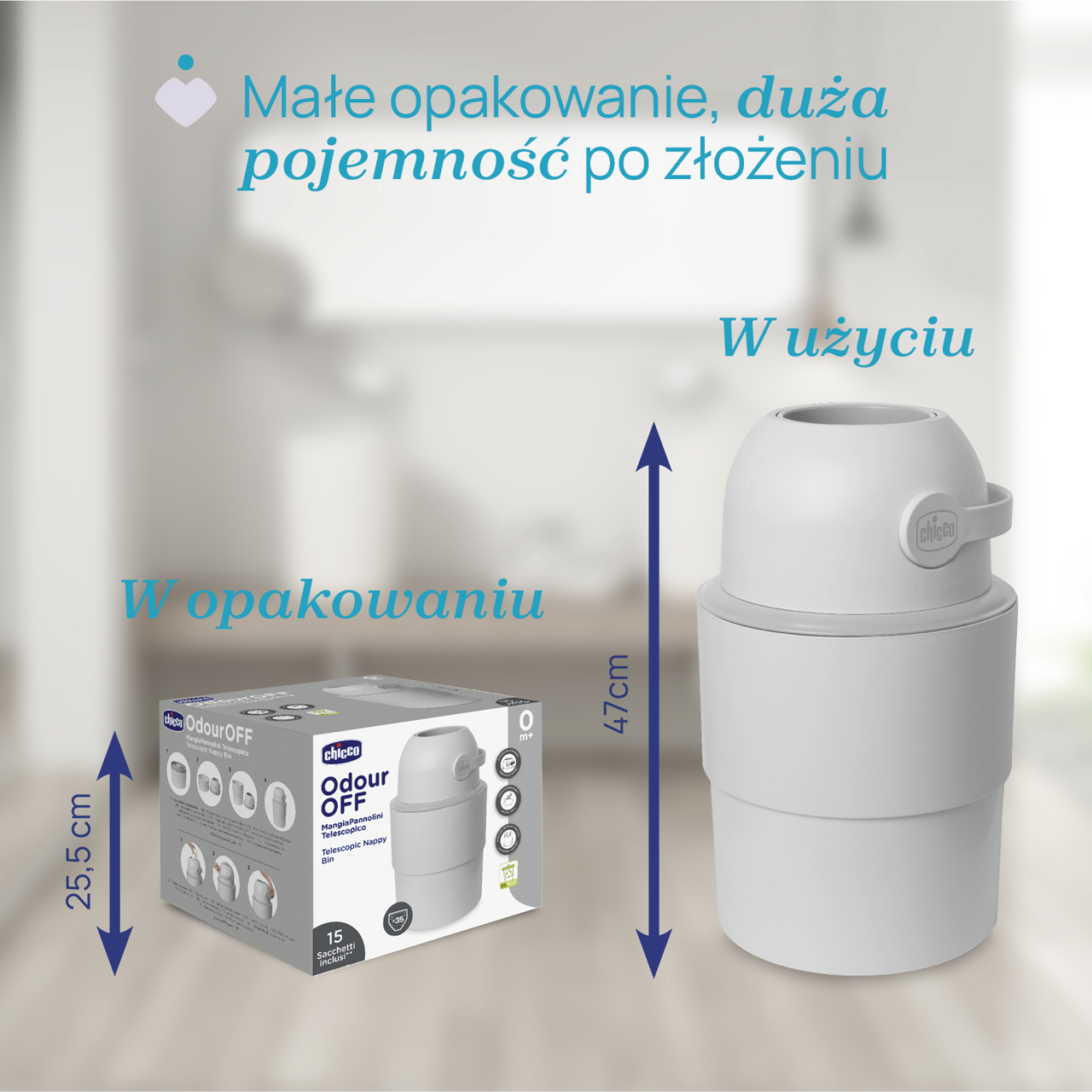 - Pojemnik na pieluchy został zaprojektowany tak, aby zapobiegać wydostawaniu się nieprzyjemnych zapachów.