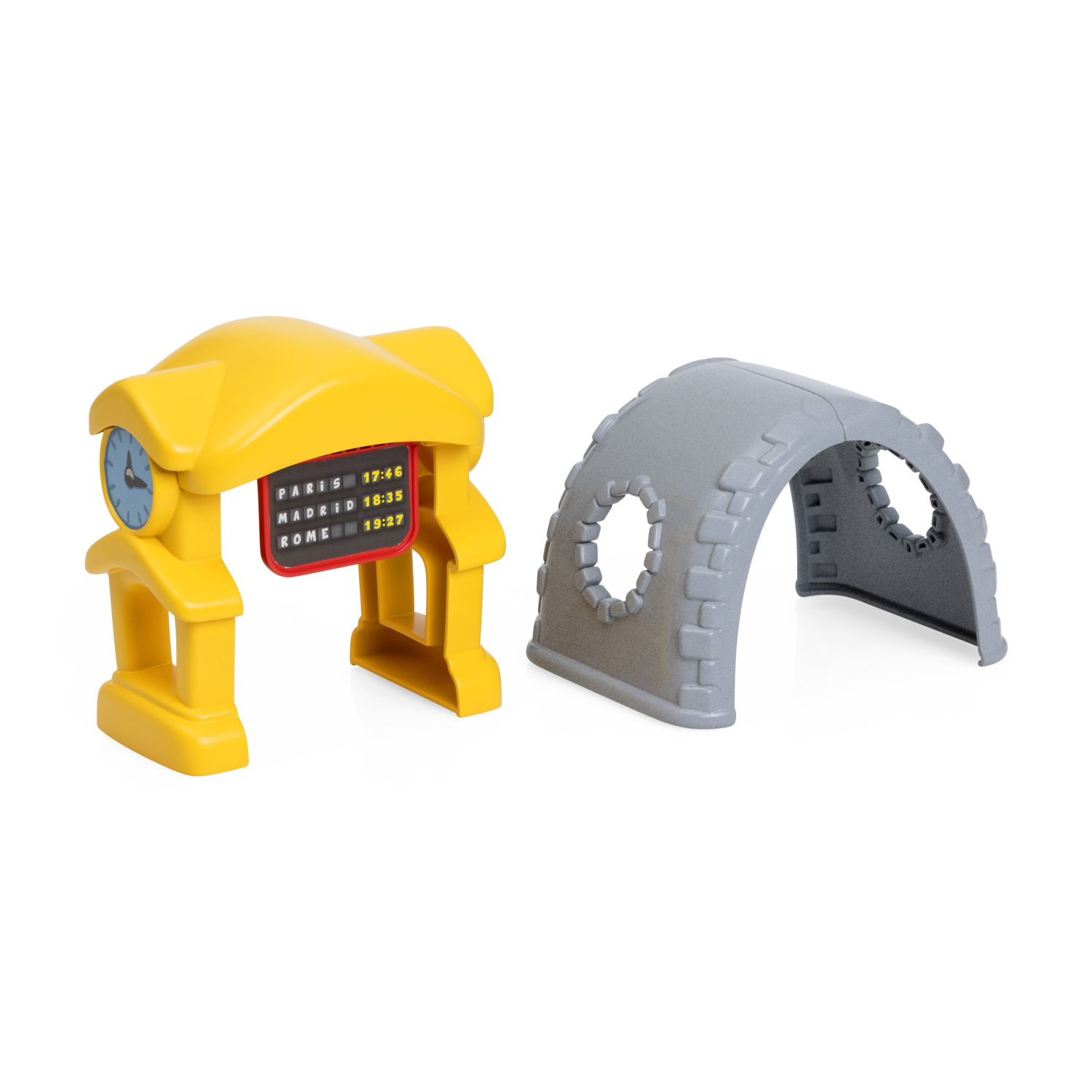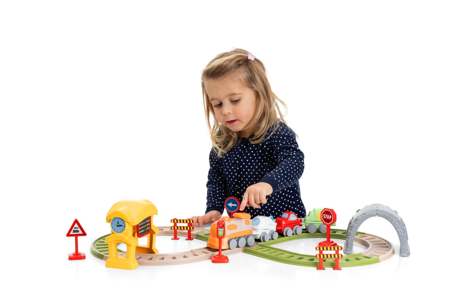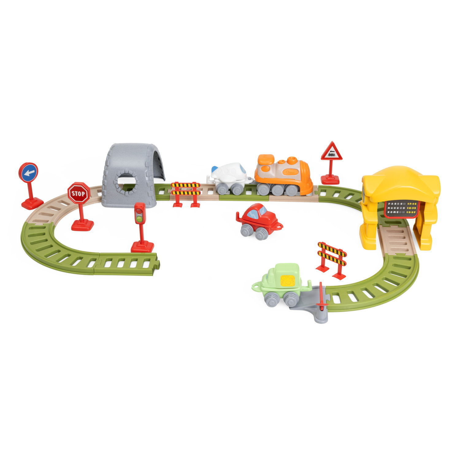 34 elementy w zestawie: elektroniczna lokomotywa, 3 wagony z wymiennymi kształtami, stacja kolejowa z rozkładem jazdy, który przesuwa się, gdy przejeżdża pociąg; tunel, 6 znaków drogowych; 4 przejazdy kolejowe oraz różne tory.