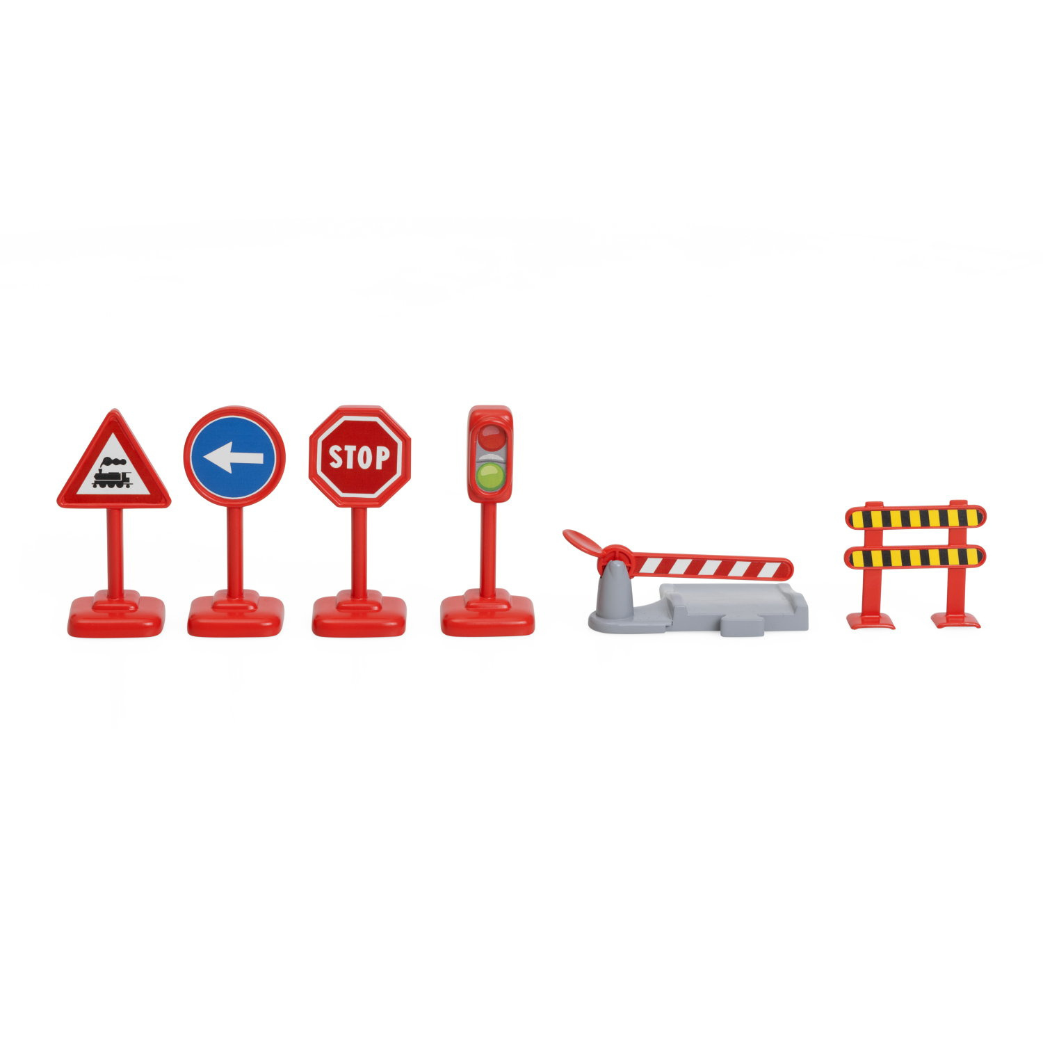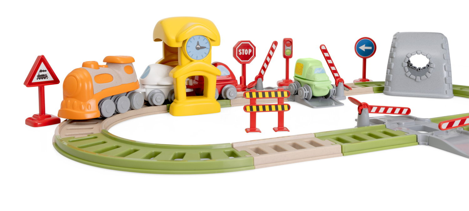 Zestaw zawiera 34 elementy, które pozwalają dziecku tworzyć własne miasteczko, stację kolejową czy plac budowy.