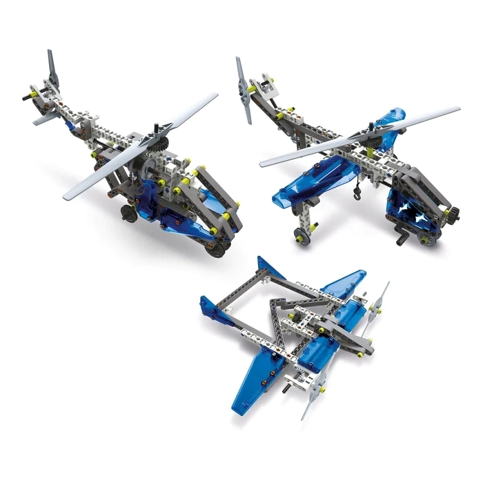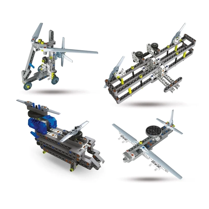 Ponad 10 modeli i 200 elementów do montażu, a w tym: pręty do montażu gondoli, panele, śmigła, koła zębate, koła pasowe i przeguby.