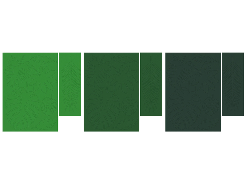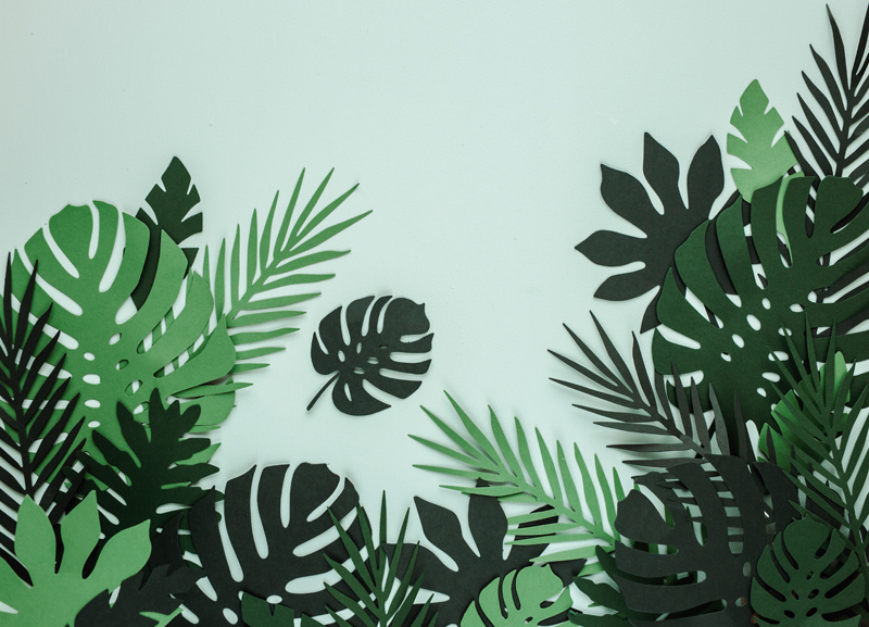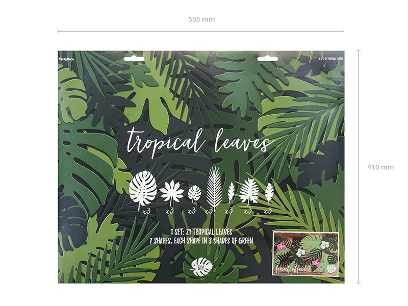 - Dekoracje papierowe Aloha - Liście tropikalne, mix, zestaw zawiera 7 różnych kształtów liści, każdy kształt w trzech odcieniach koloru zielonego. (1 op. / 21 szt.)