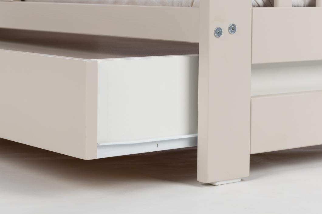 Szuflada jest związana konstrukcyjnie z łóżeczkiem za pomocą prowadnic rolkowych, co sprawia, że łatwo się wysuwa i nie rysuje podłogi.
