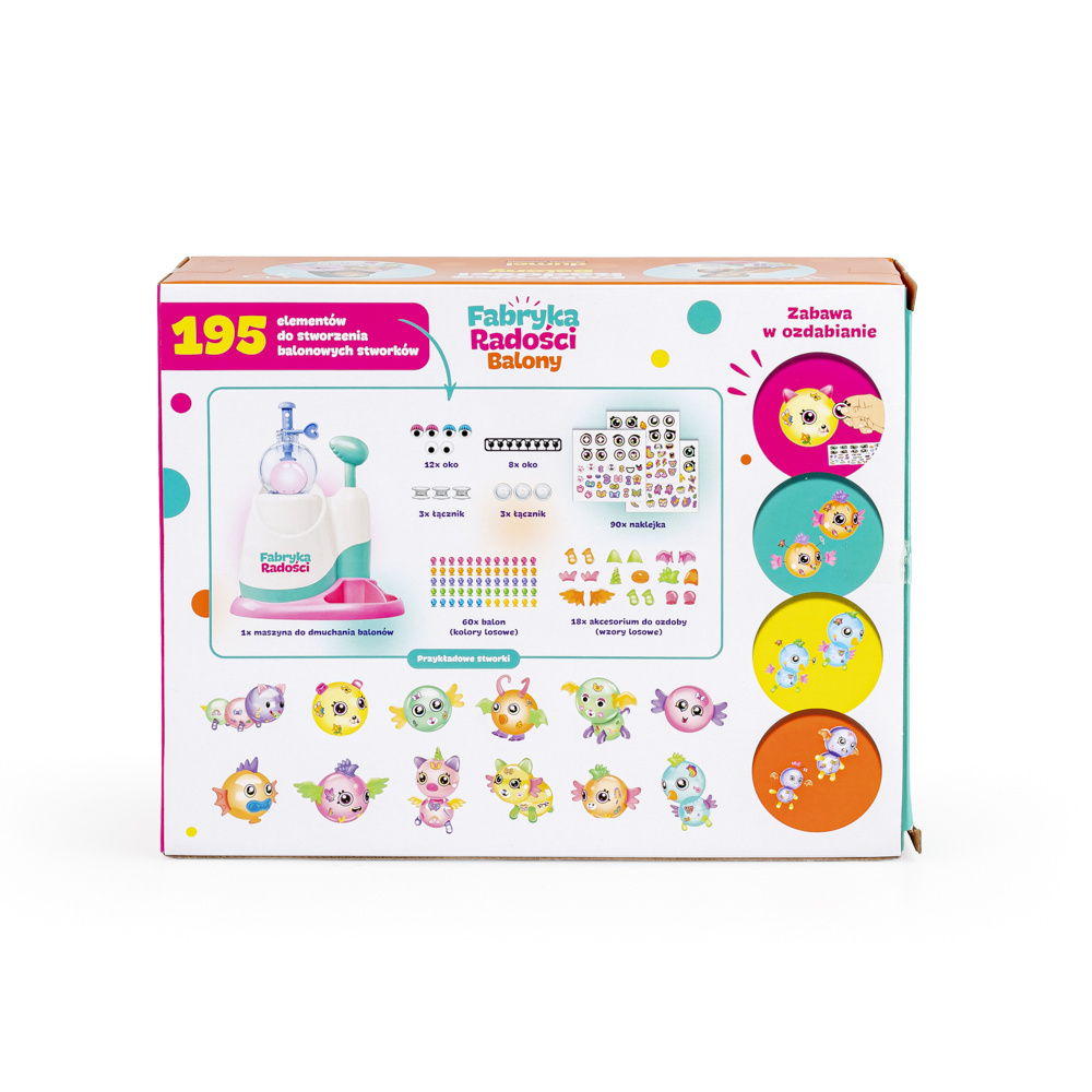 - w zestawie 195 elementów do stworzenia balonowych stworków (w tym: 60 balonów, 90 naklejek, 44 akcesoria oraz maszynka do balonów)