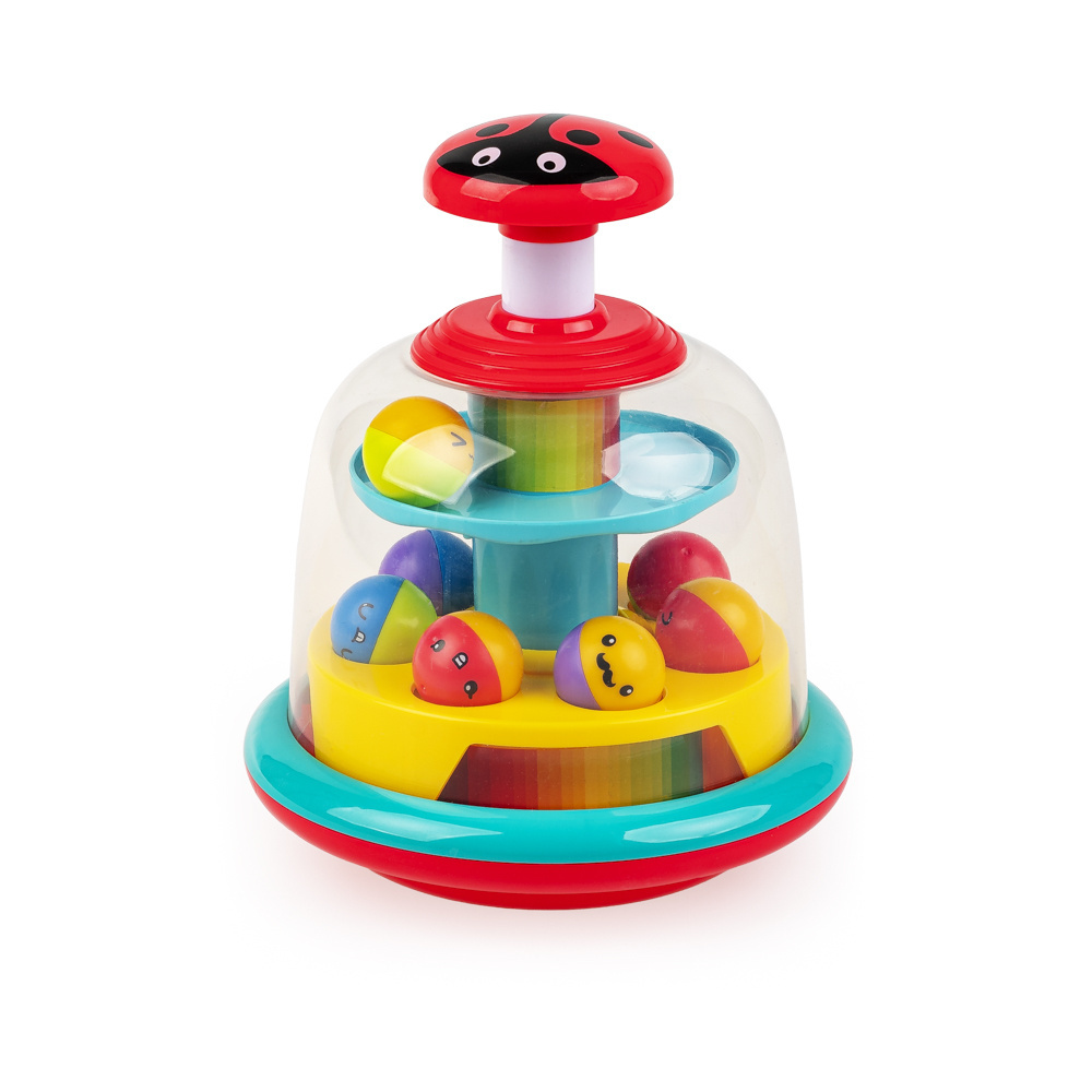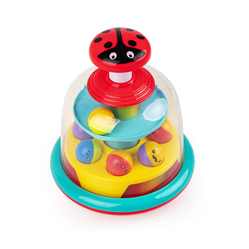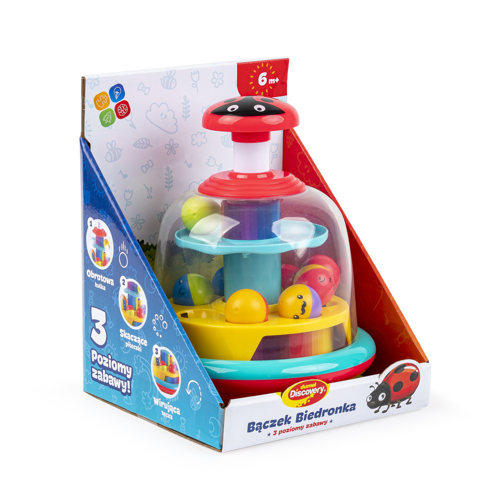 Środkowy poziom bączka wyposażony jest w dwukolorowe piłeczki, wesoło podskakujące podczas kręcenia się bączka.