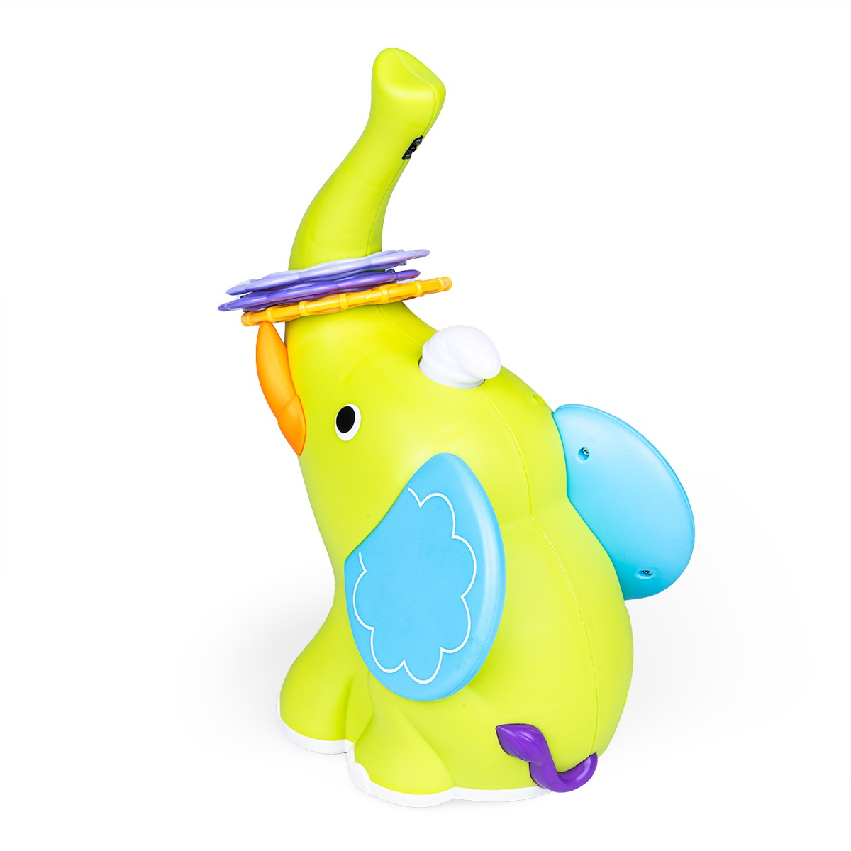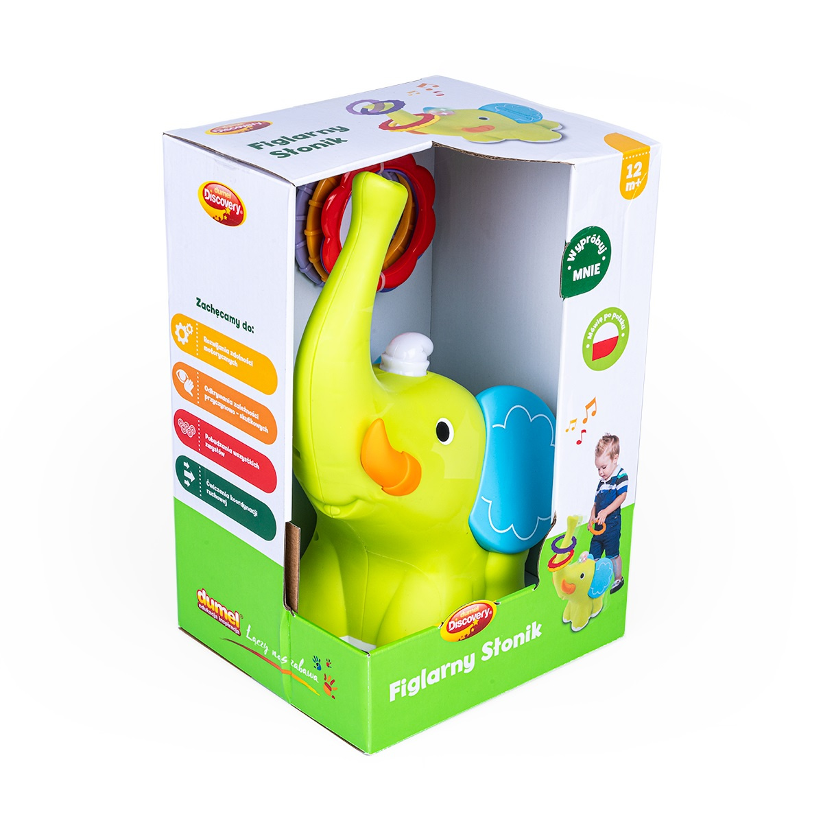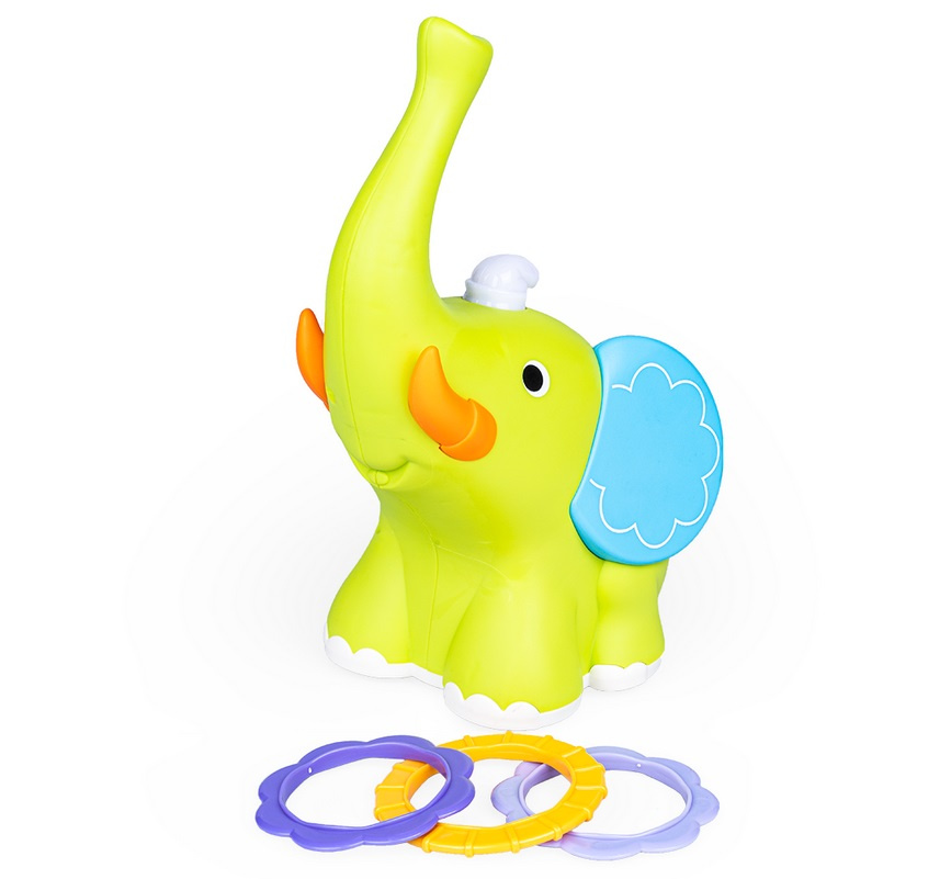 • Razem ze Słonikiem ćwicz celność i przekonaj się czy jesteś zwinniejszy od niego! Zabawa polega na wrzuceniu wprost na słoniową trąbę kolorowych obręczy, które znajdują się w zestawie.
