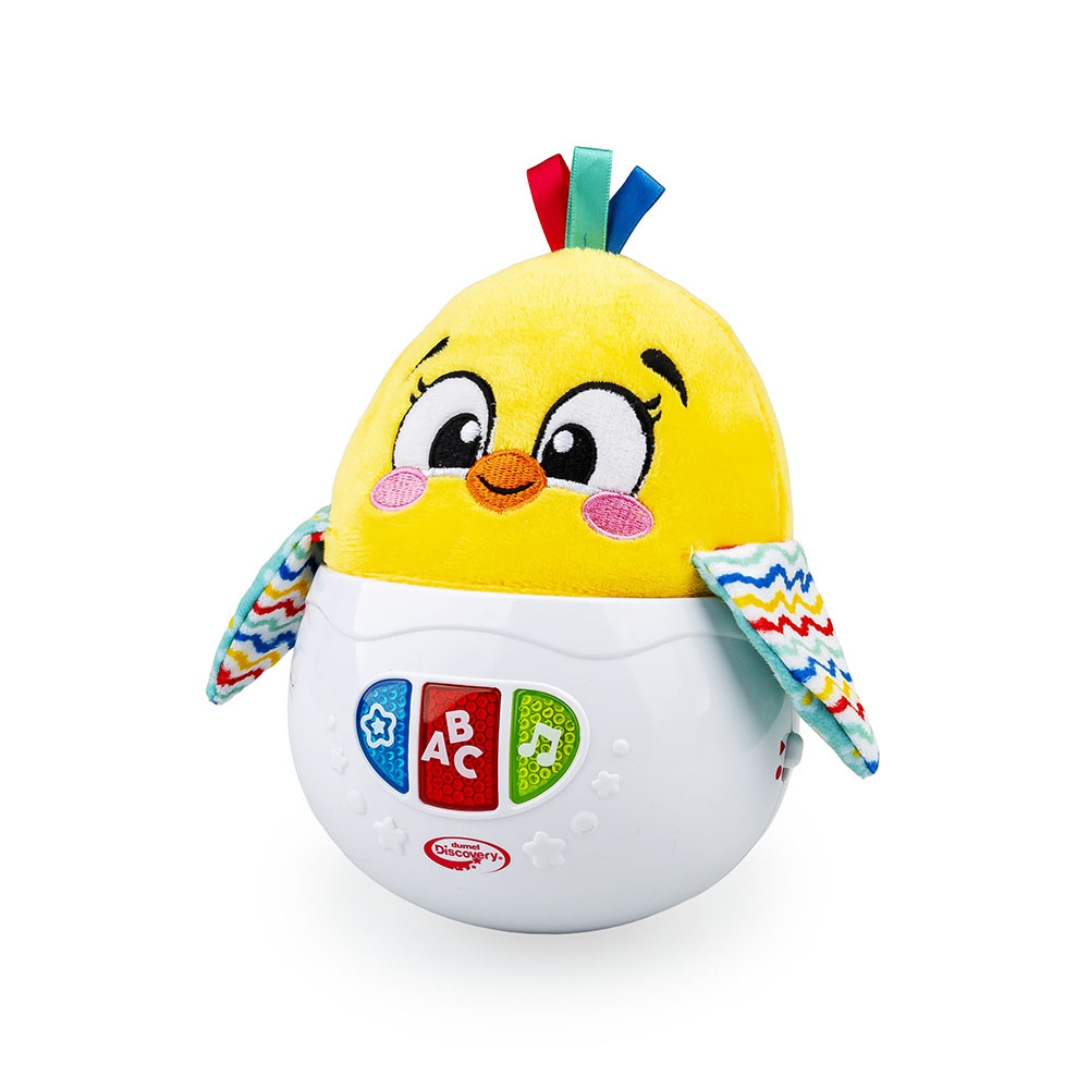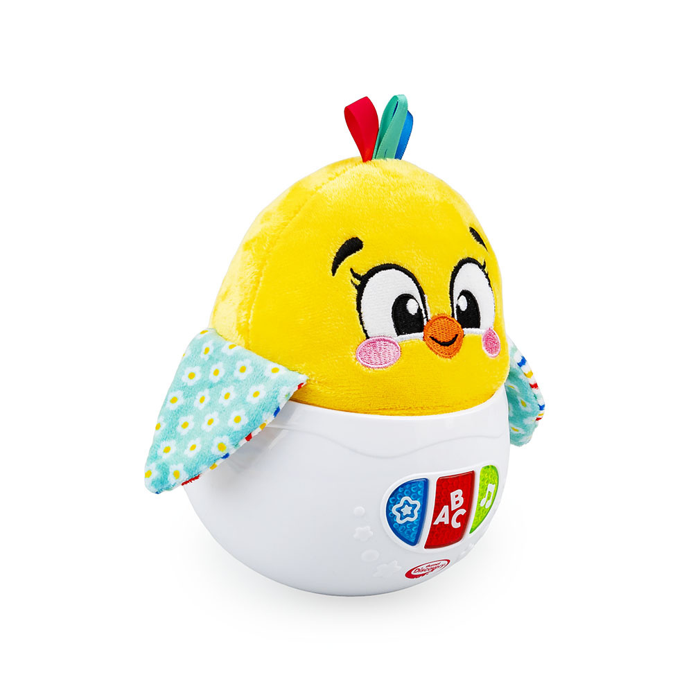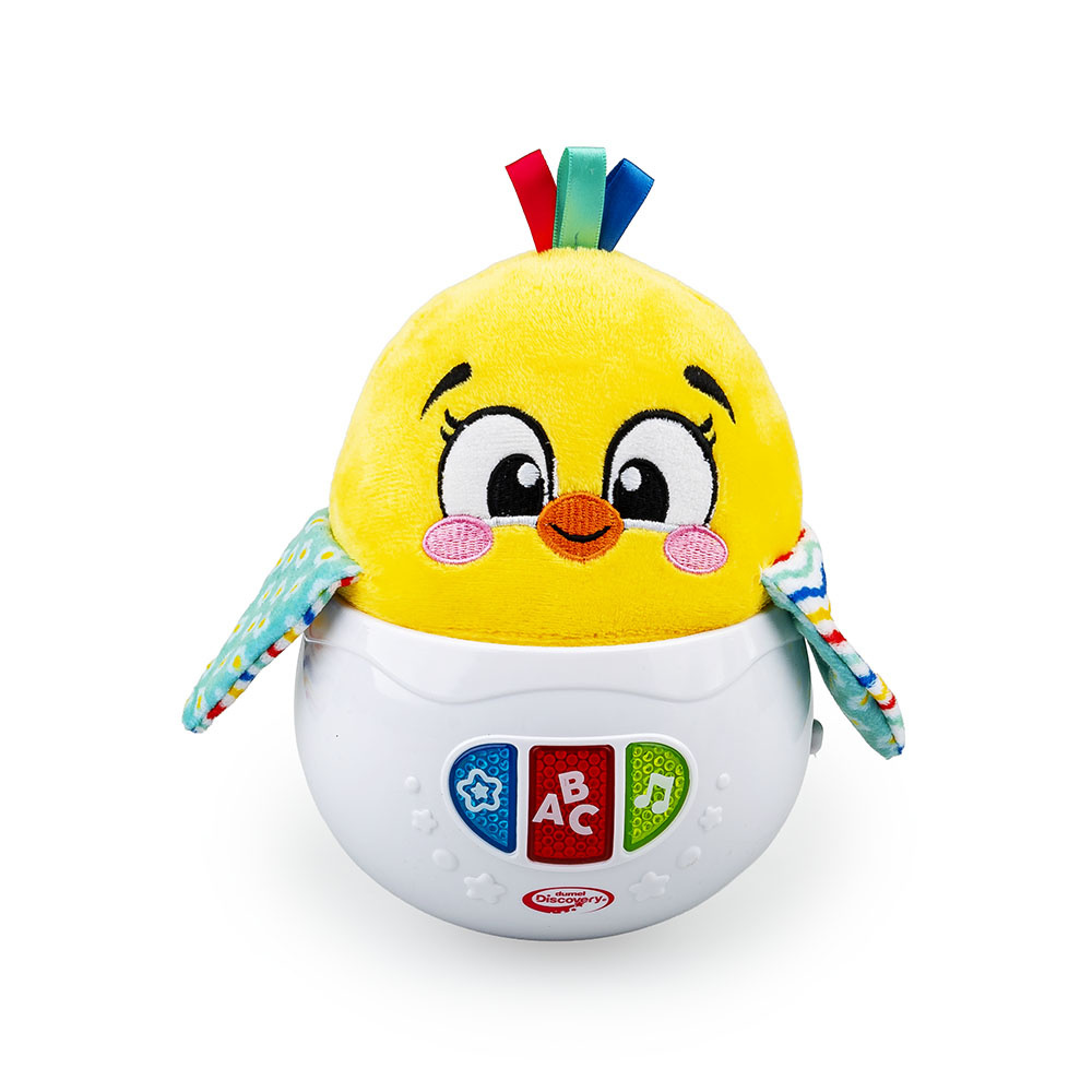 - Uroczy kurczaczek w zabawkowej skorupce buja się wesoło, odtwarzając przy tym przeróżne dźwięki.