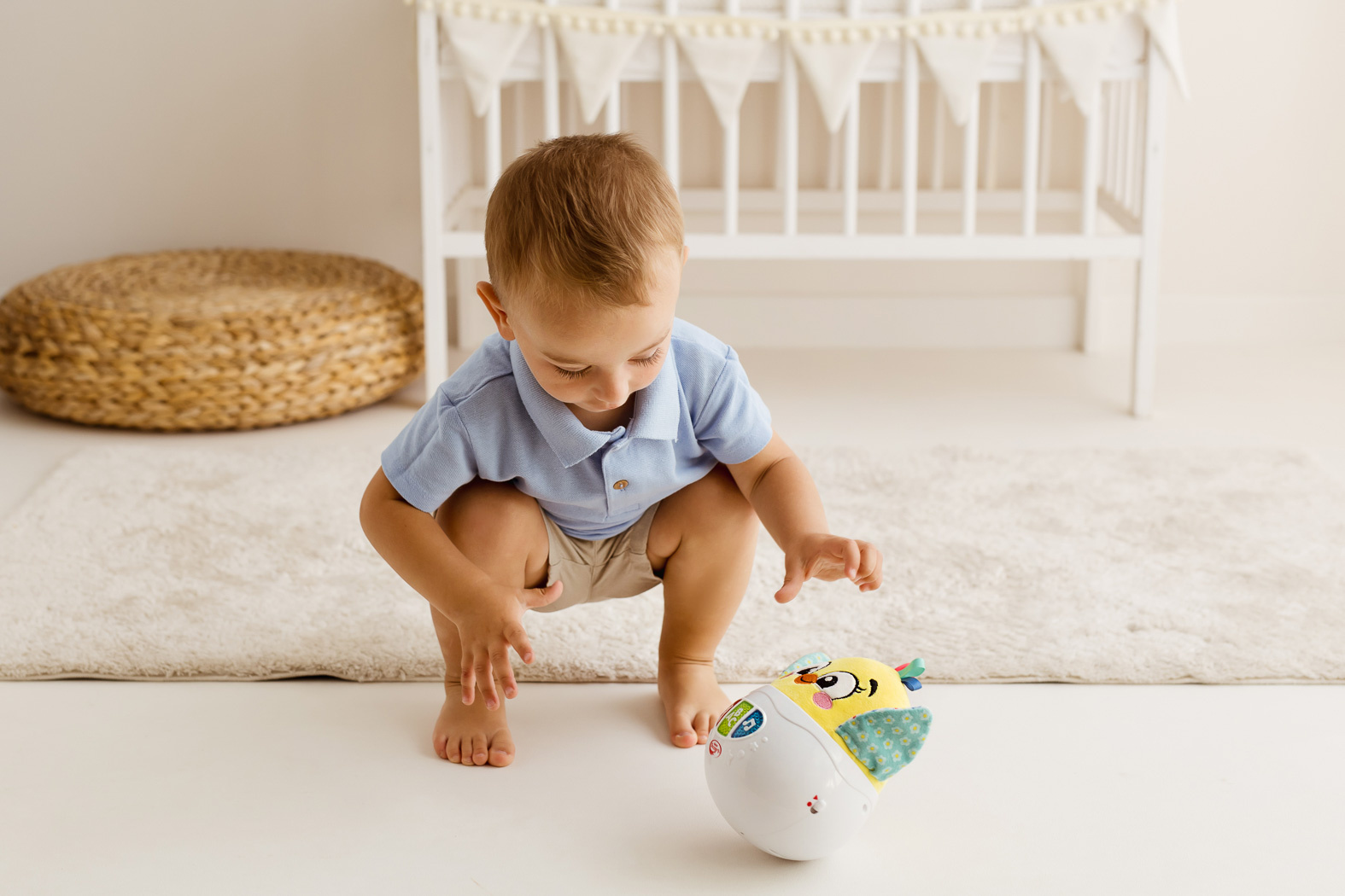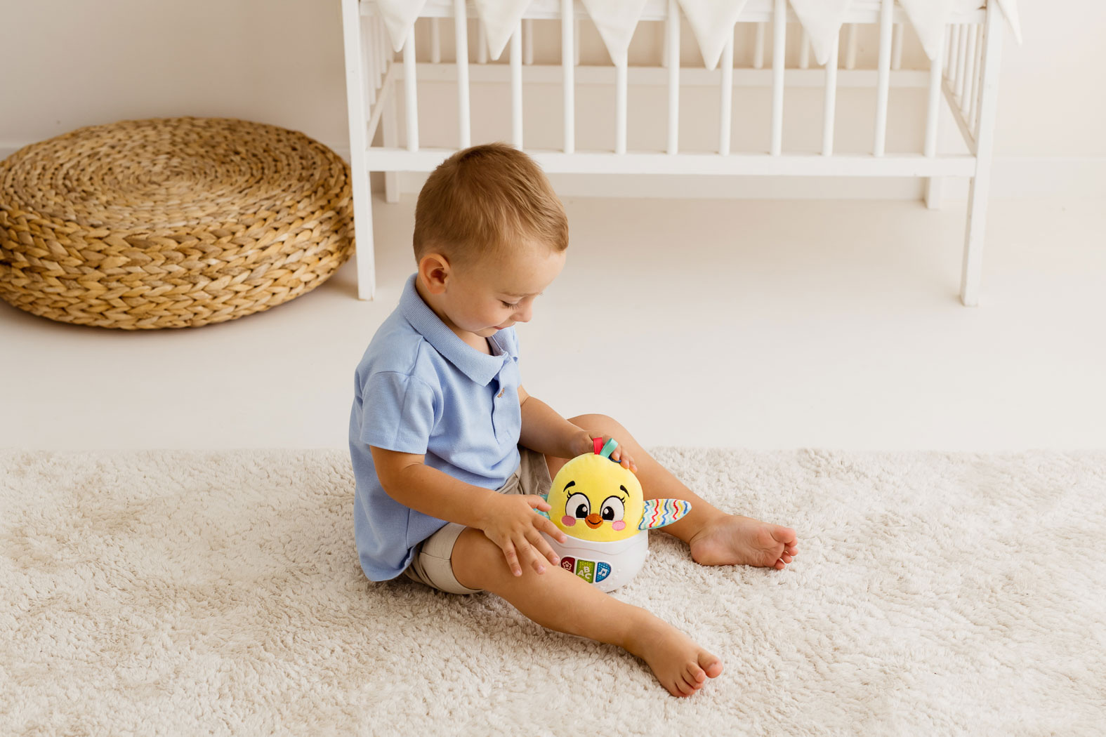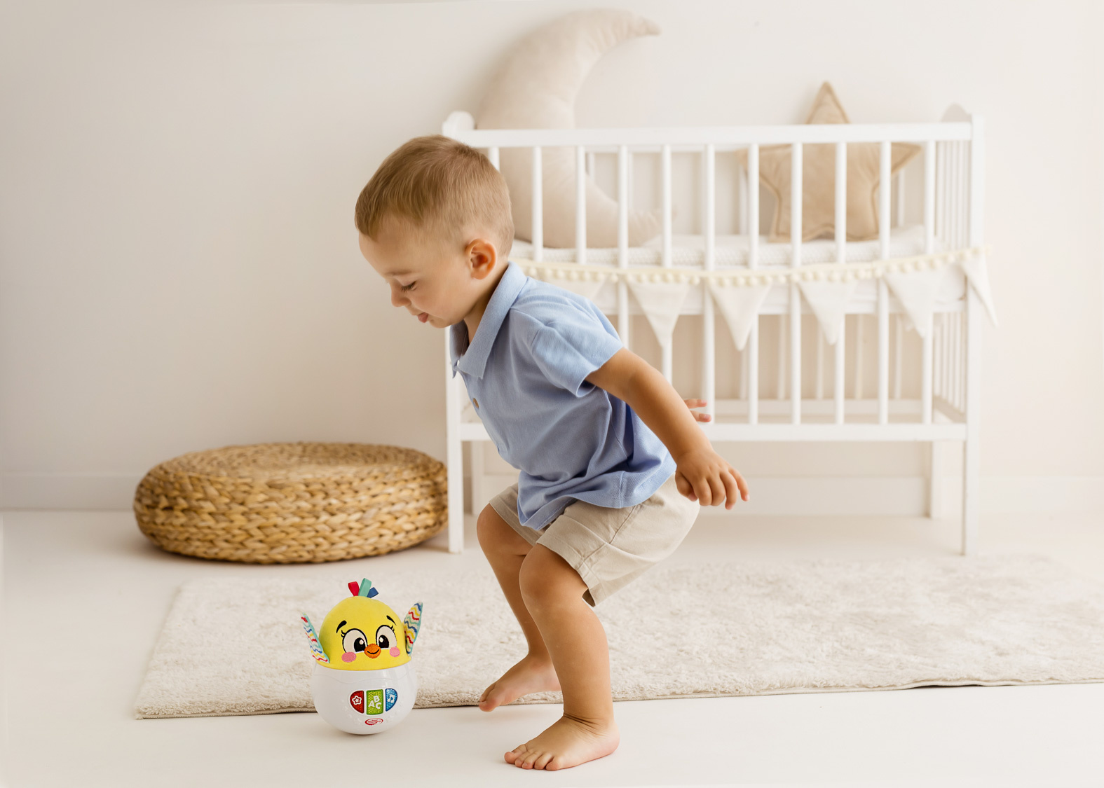 - Uroczy kurczaczek w zabawkowej skorupce buja się wesoło, odtwarzając przy tym przeróżne dźwięki.