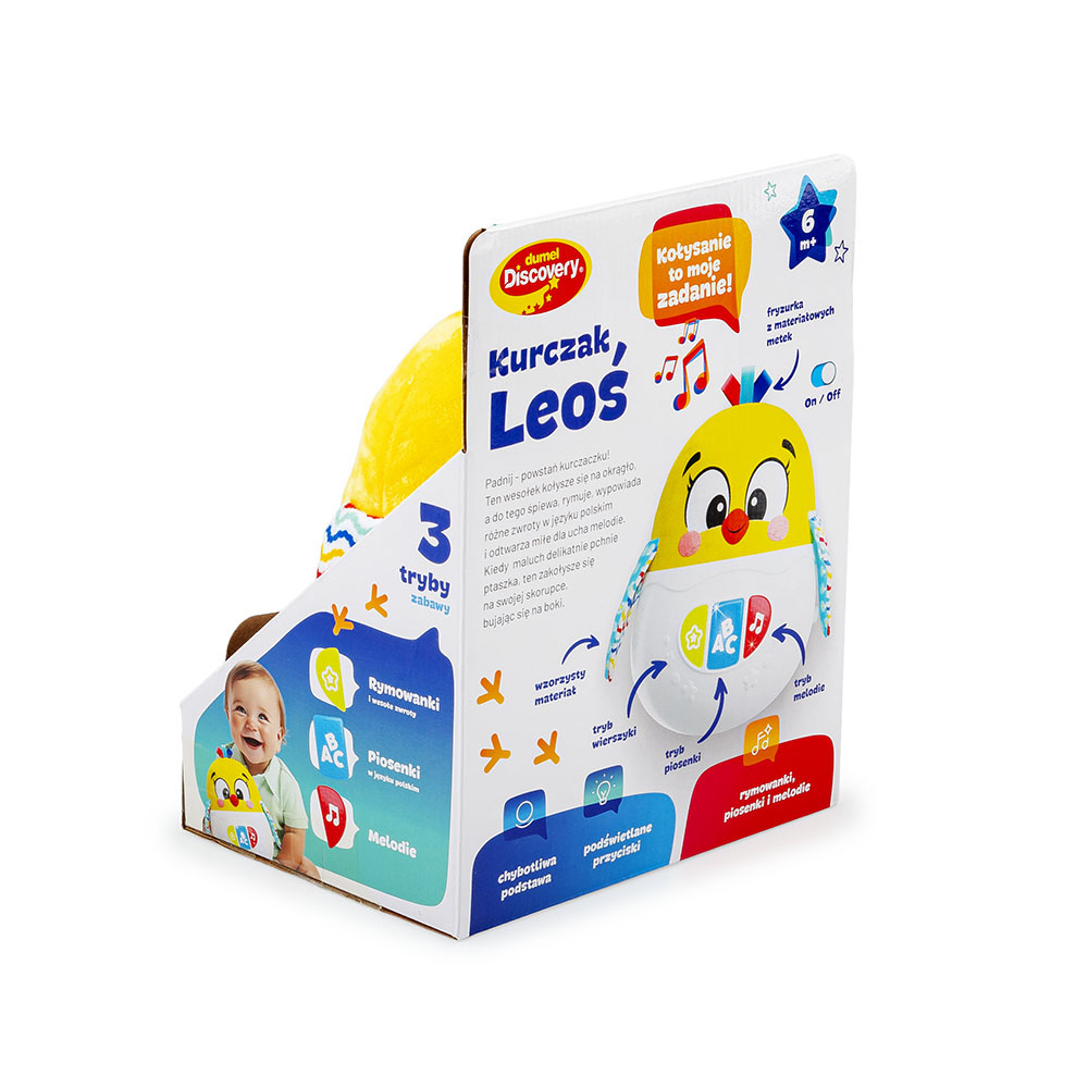 Leoś zna kilka krótkich rymowanek oraz wesołe piosenki i melodie, a gdy maluch pchnie go do tyłu lub w bok, kurczaczek zakołysze się na podstawce i wróci do bazowej pozycji. Zabawka wyposażona jest w trzy przyciski, różniące się kolorem i obrazkiem, a każdy z nich aktywuje inny tryb. Kwiatek uruchamia wierszyki, symbol ABC – piosenki w języku polskim, a nutka – wesołe melodie.