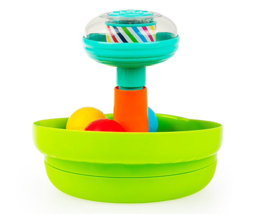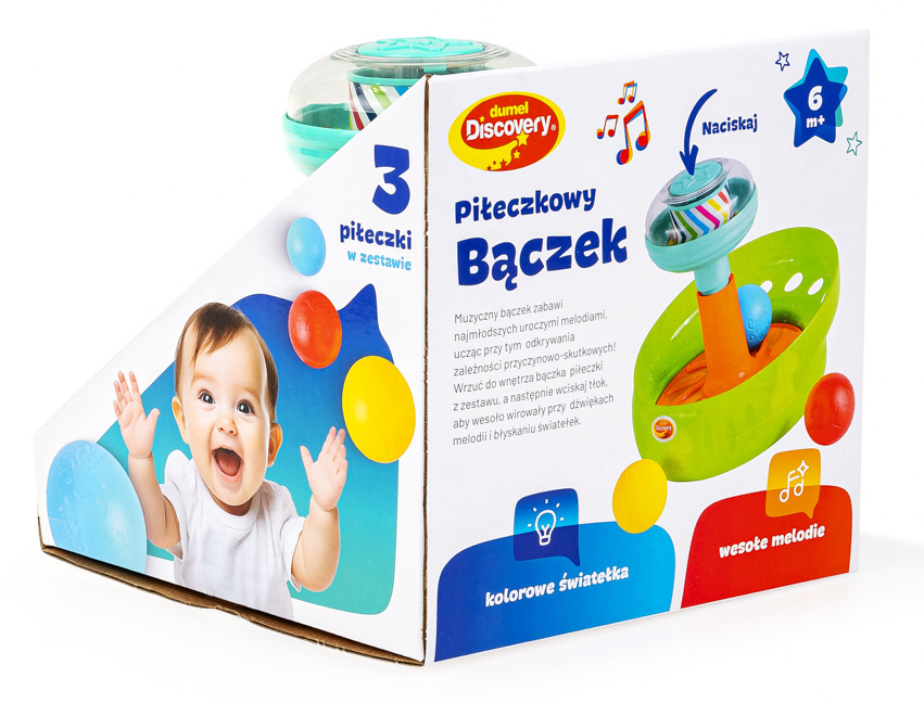 Bączek wyposażony został w melodie i światełka, które to funkcje aktywuje wciśnięcie tłoka. W zestawie znajdziemy trzy piłeczki, a każda z nich ozdobiona jest innymi, wytłoczonymi kształtami: czerwona gwiazdkami, żółta listkami, a niebieska motylkami.