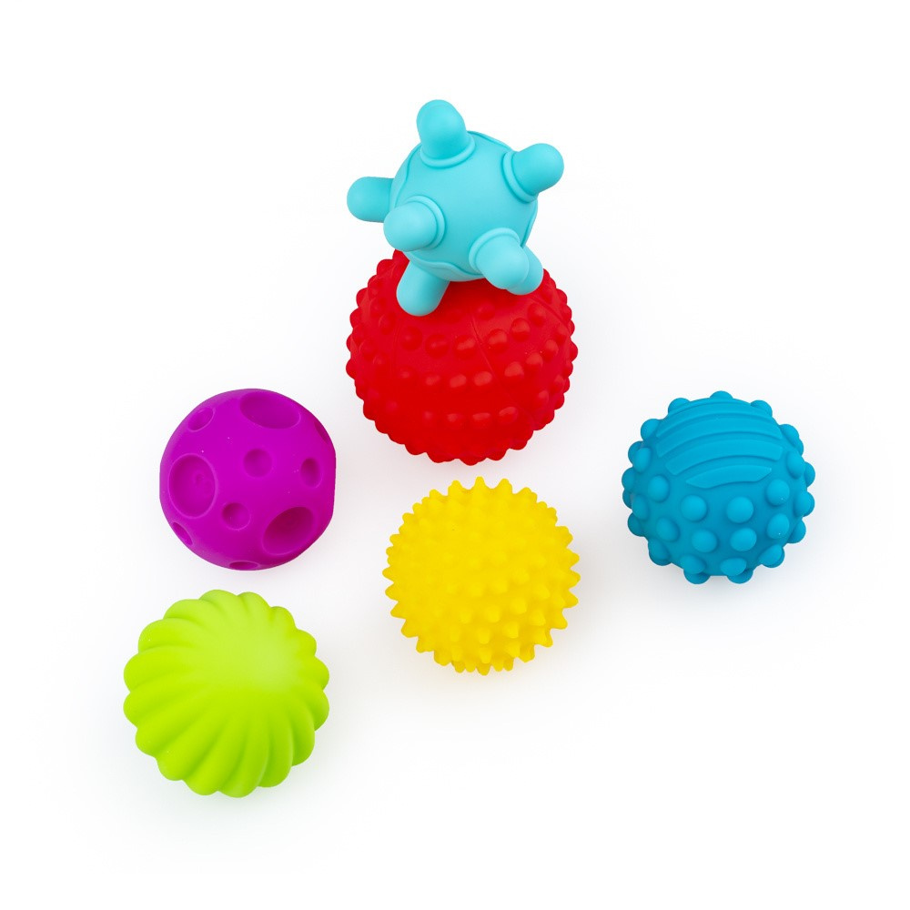 Zestaw zawiera sześć miękkich piłeczek, a każda z nich różni się kształtem, kolorem oraz wypustkami. Nieregularna powierzchnia zabawek i ich rozmiar, dostosowany do małych rączek, ułatwi bobasowi chwytanie piłeczek.