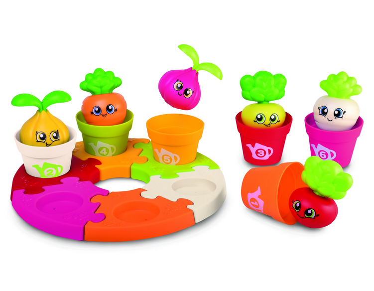 Zamieszaj w kolorach, zmieniając warzywka i doniczki miejscami. Ten soczyście kolorowy zestaw składa się z aż 18 elementów: sześciu warzyw, sześciu odpowiadających im kolorystycznie doniczek oraz sześciu puzzli do złożenia tacki na doniczki, które można połączyć w pierścień lub inny kształt.