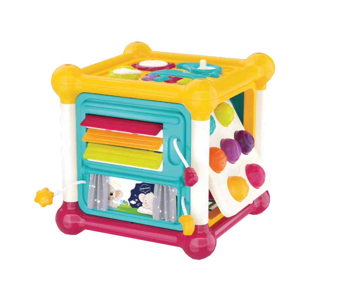 Każda ze ścianek kostki to inna aktywność. Znajdziemy tu trybiki do kręcenia, żaluzje do odsłaniania, zasłonki do rozsuwania, elementy do wciskania i wyciągania, sznureczki do przekładania klocków, dołączonych do zestawu, oraz ściankę muzyczną, na której znajdują się kształty instrumentów muzycznych, a umieszczone w nich przyciski uruchamiają dźwięki i melodie.