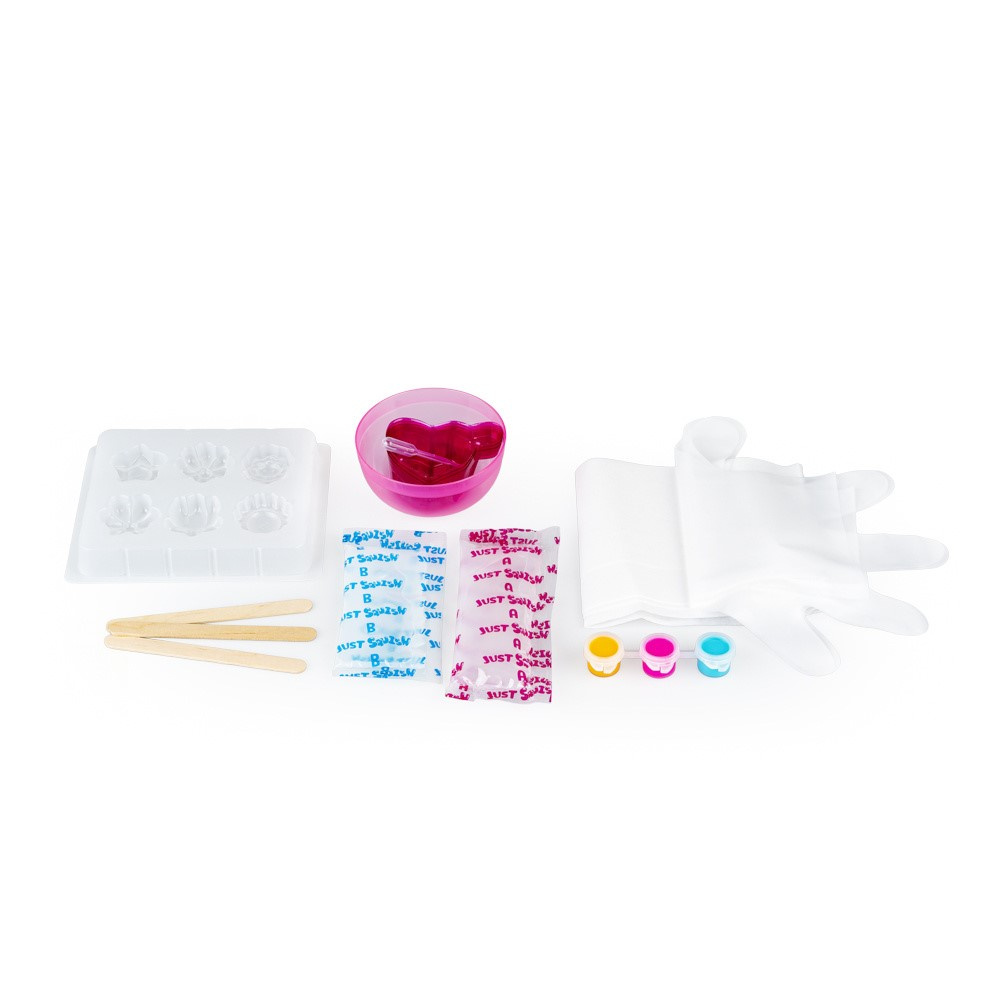 Wystarczy zmieszać ze sobą klejące masy, rozlać je do kubeczków i do każdego z nich dodać barwnik w innym kolorze, a następnie zalać foremkę barwnymi miksturami, zgodnie z własnym pomysłem. W zestawie znajduje się pipeta, która ułatwi aplikowanie niewielkiej ilość mieszanki do foremki, w celu wykonania kwiatkowych detali. Po zapełnieniu foremki, odstaw ją w bezpieczne miejsce do wyschnięcia, a gdy squishy będą już gotowe, delikatnie wyjmij je z foremki.