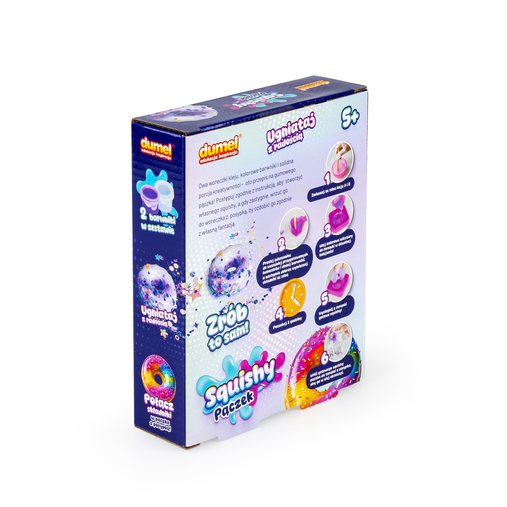 Kreatywny zestaw SQUISHY zawiera wszystko czego potrzeba, do wykonania własnego, kolorowego pączka, którego można zgniatać do woli. W tym celu należy połączyć ze sobą klejące masy, rozlać je do kubeczków i do każdego z nich dodać barwnik w innym kolorze, a następnie wlać tak przygotowane mikstury do pączkowej formy. Po całkowitym wyschnięciu, gotowego pączka można wyjąć z foremki, aby cieszyć się samodzielnie stworzonym squishy.