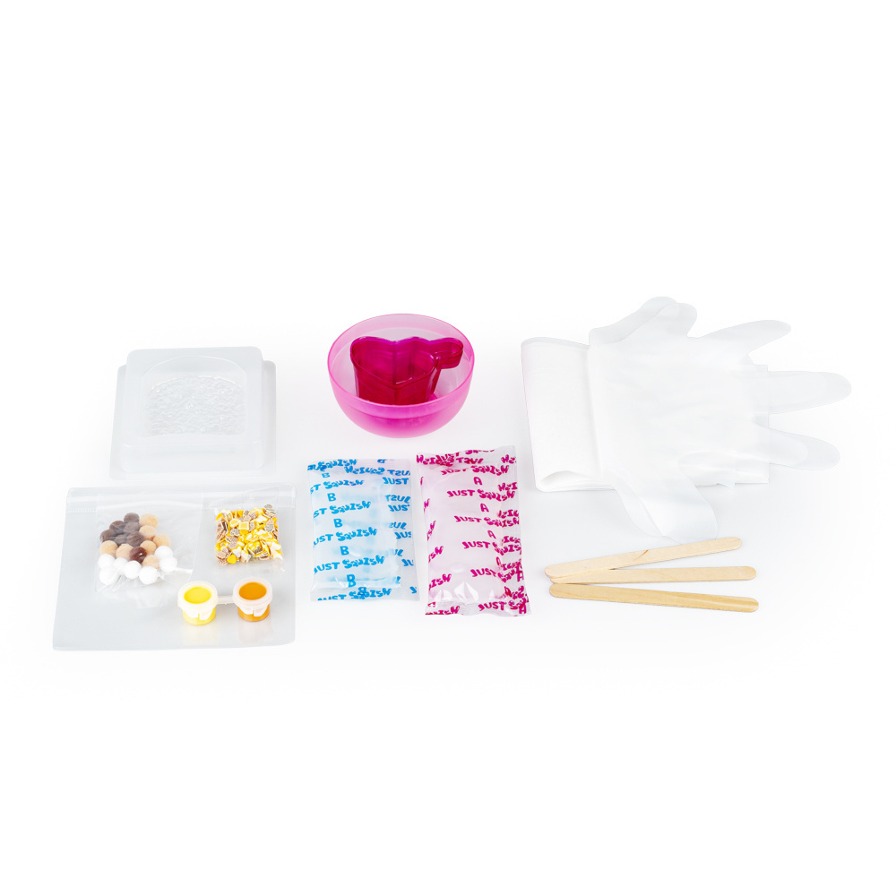 Ten kreatywny zestaw umożliwia stworzenie własnej figurki squishy i to w kształcie przypominającym prawdziwego tosta! Aby przystąpić do zabawy, zmieszaj ze sobą kleje, rozlej je do kubeczków, a do każdego z nich dodaj barwnik w innym kolorze. Teraz najlepsze! Wlej do foremki barwne mikstury, samodzielnie decydując o tym jak będzie wyglądał tost. Gdy zapełnisz foremkę, odstaw ją do całkowitego wyschnięcia, a następnie delikatnie wyciągnij z niej gotową figurkę squishy.