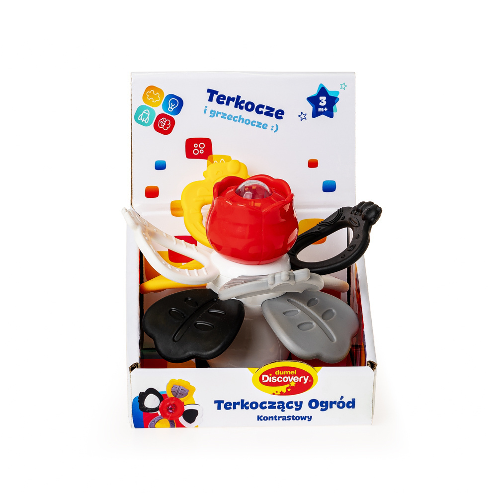 W zabawce kryje się jeszcze jedna niespodzianka – terkotek. Po przekręcaniu górnych i dolnych gryzaczków w odwrotnych względem siebie kierunkach, wydaje on wesoły odgłos.