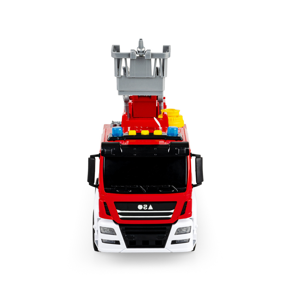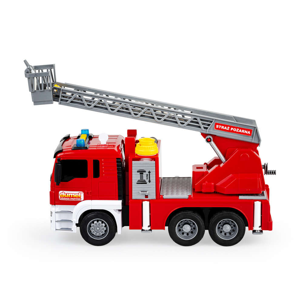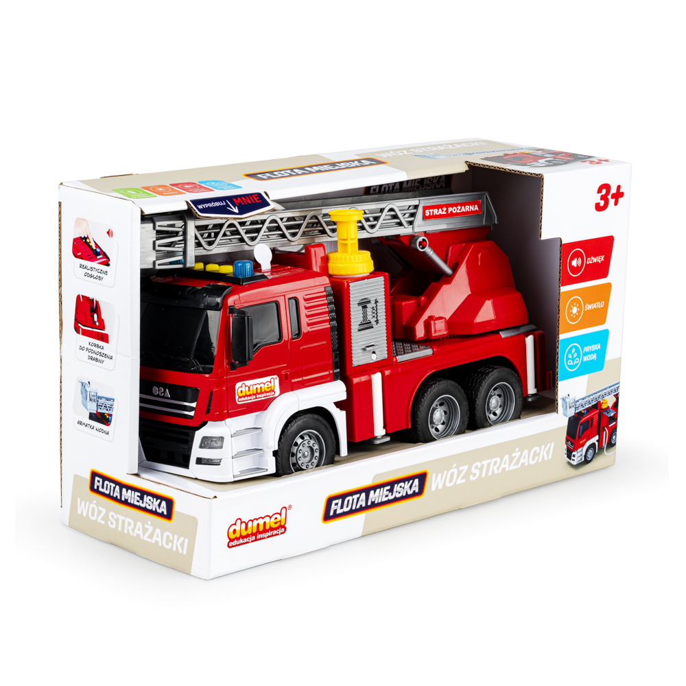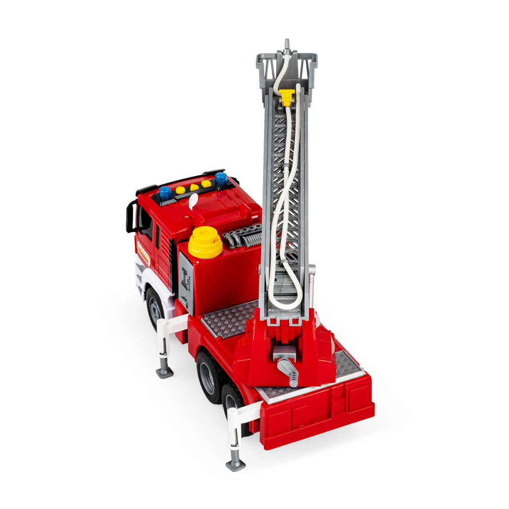 Pojazd wyposażony został w najprawdziwszy zbiornik na wodę wraz z wężykiem i armatką wodną, pozwalającą na pryskanie wodą! Dodatkowo, znajdziemy tu ruchome elementy – korbkę do podnoszenia drabiny oraz ręcznie rozsuwaną drabinę.