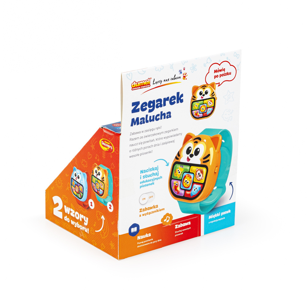 - Niebieski kociak to pierwszy „zegarek” maluszka, który zamiast godzin, nauczy powitań dostosowanych do określonej pory dnia!
