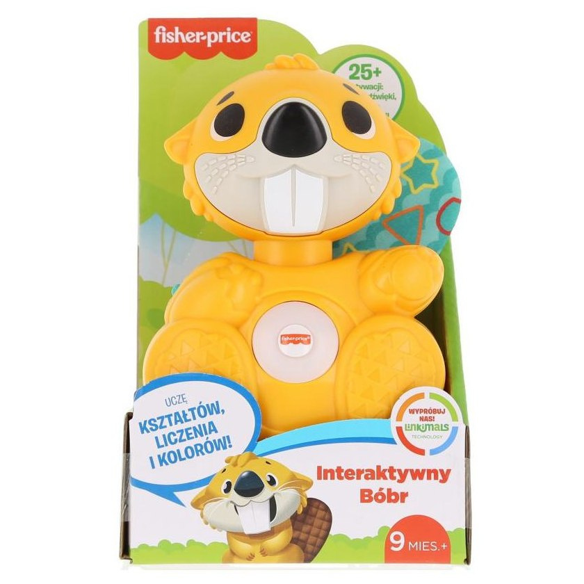 Gdy dziecko naciśnie głowę bobra, jego miękki ogon porusza się, a piosenki i zwroty pomagają uczyć kształtów, liczenia i kolorów.