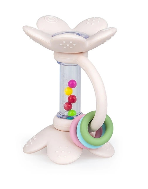 Urocze kwiatki z wypustkami na płatkach sprawdzą się świetnie w roli gryzaka, przynosząc ulgę ząbkującym maluchom. Pomiędzy kwiatkami znajduje się pionowa tuba wypełniona koralikami, które, przy potrząsaniu zabawką, wesoło grzechoczą. Praktyczny uchwyt, ozdobiony trzema ruchomymi kółeczkami, ułatwi małym rączkom chwytanie zabawki.